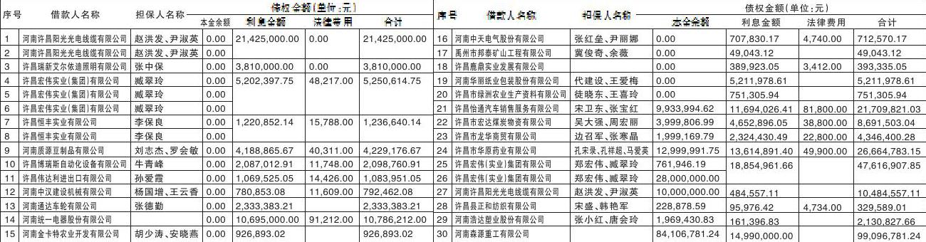 根据许昌市投资总公司与许昌市国有产业投资有限公司签订的《关于许昌市企业发展互助资金及项下委托贷款债权无偿划转暨资产移交协议》《关于许昌市企业发展互助资金及项下委托贷款债权无偿划转暨资产移交补充协议》,许昌市投资总公司已将其对以下公告清单中的债务人及其保证人享有的主债权及保证合同项下的全部权利,依法转让给许昌市国有产业投资有限公司。许昌市投资总公司与许昌市国有产业投资有限公司联合公告通知各债务人及保证人以及其他相关各方。 许昌市国有产业投资有限公司作为上述债权的受让方,现公告要求公告清单中所列包括但不限于借款人、保证人及其相关承债主体、清算主体等相关当事人,从公告之日起立即向许昌市国有产业投资有限公司履行主债权合同及保证合同约定的偿付义务或相应的担保责任。 特此公告。 许昌市投资总公司 许昌市国有产业投资有限公司 2020年7月21日 注: 1.本公告清单列示截至基准日(2019年9月30日,其中涉及河南森源重工有限公司债权基准日为2020年4月29日)的债权本金、利息余额,基准日后债务人和担保人应支付的利息、违约金、罚息、其他法律费用等按照相关合同、生效法律文书及法律法规的规定计算。 2.若债务人、保证人因各种原因更名、改制、歇业、吊销营业执照或丧失民事主体资格的,请相关承债主体及/或主管部门代为履行义务或履行清算责任。 3.本公告清单列示的金额由于计算方法等原因与实际金额可能存在误差,具体以相关合同及有效法律文书计算为准。 4.本公告如有漏登、错登,以实际债权凭证为准。 许昌市投资总公司 联系人:孙先生,联系电话:15038966688 联系地址:许昌市魏都区建安大道东段市财政综合大楼4楼 许昌市国有产业投资有限公司 联系人:苏先生,联系电话:13193913699 联系地址:许昌市魏都区建安大道东段市财政综合大楼6楼 |