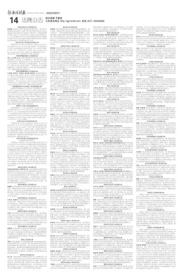 郑州市金水区人民法院公告鲁迎春:何冠军申请执行鲁迎春民间借贷纠纷一案,案号为(2020)0105执9883号,因你下落不明,现依法向你公告送达(2020)0105执9883号执行通知书、报告财产令、限制高消费令和执行决定书,本公告自发布之日起,经过60日即视为送达。自公告期满之日起7日内到本院联系办理有关本案执行过程中的有关事宜,逾期不到视为放弃相应权利,并承担相应的法律责任,本院将依法执行本案。 郑州市中级人民法院司法拍卖公告 河南省郑州市中级人民法院将于2020年9月14日10时至2020年9月15日10时止(延时的除外)在河南省郑州市中级人民法院淘宝网司法拍卖网络平台上对24件玉器饰品(第二次),详情请关注(网址:http://sf.taobao.com/law_court.htm?spm=a213w.3064813.0.0.WmDlVt&user_id=1991614219,户名:河南省郑州市中级人民法院)。 郑州市管城回族区人民法院公告岳文、王文博、王元:本院受理河南疾风达货运有限公司申请追加岳文、王文博、王元为被执行人一案,案号为(2020)豫0104执异204号,现依法向你公告送达追加被执行人申请书、听证通知书、开庭传票、合议庭组成通知。本公告自发出之日起,经过60日即视为送达。开庭时间定于公告期限届满后第三日(遇节假日顺延)上午9时,地点在管城法院执行局。逾期本院将依法缺席听证。 郑州市管城回族区人民法院公告牛喜梅、徐胜伟、徐胜杰、徐向峰、徐胜利:本院受理燕留忠申请追加牛喜梅、徐胜伟、徐胜杰、徐向峰、徐胜利为被执行人一案,案号为(2020)豫0104执异220号,现依法向你公告送达追加被执行人申请书、听证通知书、开庭传票、合议庭组成通知。本公告自发出之日起,经过60日即视为送达。开庭时间定于公告期限届满后第三日(遇节假日顺延)上午9时,地点在管城法院执行局。逾期本院将依法缺席听证。 郑州高新技术产业开发区人民法院拍卖公告 河南省郑州高新技术产业开发区人民法院将于2020年9月25日10时起至2020年9月26日10时止(延时的除外)在郑州高新技术产业开发区人民法院京东网司法拍卖网络平台上对:位于金水区二环路11号院1号楼东1单元6层28号【豫(2019)郑州市不动产权第:0079990号】的房产进行公开拍卖活动(详情请见网址:http://sifa.jd.com/2238(部分页面上法院简称为“开发区”)。同时公告通知案件当事人、优先权人按时参加拍卖活动,拍卖标的的相关权利人及时向法院主张权利,逾期主张视为放弃权利。 郑州市二七区人民法院拍卖公告 河南省郑州市二七区人民法院将于2020年10月12日10时起至2020年10月13日10时止(延时的除外)在河南省郑州市二七区人民法院淘宝网司法拍卖网络平台上对位于二七区南福华街东29号楼5单元3层57号(不动产权证号:0201016942)房产进行公开拍卖活动,详情请关注网址:http://sf.taobao.com/0371/11?spm=a213w.3065169.0.0.M03r4A,户名:郑州市二七区人民法院。 开封市中级人民法院拍卖公告 河南省开封市中级人民法院定于2020年10月9日10时至2020年10月10日10时(延时除外),在京东网络司法拍卖平台上(www.jd.com)第一次公开拍卖河南省开封市复兴大道以北锦诚盛世v1·龙园12号楼1-4层商业房地产。现公告通知案件当事人、相关优先权利人及时向法院主张自己的合法权利,逾期不主张者视为放弃权利,并承担相应的法律后果。详情见京东网平台(网址:www.jd.com)。咨询电话:0371-23806009(苗法官)。 平顶山市中级人民法院拍卖公告 (2020)豫04执36号之一 本院将定于2020年9月18日10时起至2020年9月19日10时止在平顶山市中级人民法院淘宝网司法拍卖网络平台上(网址:www.taobao.com,户名:平顶山市中级人民法院)对位于河南省许昌市魏都区南关办事处南关大街许昌天都糖酒副食(集团)有限公司4幢1层(1层附图红线内部分,房屋产权证号:许房权证市字第10016800号)、4幢2层(2层全部,房屋产权证号:许房权证市字第10016799号)、4幢3至4层(3至4层全部,房屋产权证号:许房权证市字第10016801号)依法进行公开拍卖,上述房产的承租人享有优先购买的权利,详情请登录上述网址查看。联系电话:0375-2862777,16696981588(陈法官)联系地址:河南省平顶山市新城区长安大道与清风路交叉口平顶山市中级人民法院执行局。 信阳市平桥区人民法院公告信阳亿佰伴装饰工程有限公司:本院受理原告何喜林诉你装饰装修合同纠纷一案,因无法直接向你送达法律文书,依照《中华人民共和国民事诉讼法》第九十二条的规定,向你公告送达(2020)豫1503民初379号民事判决书。自公告发出之日起,经过60日即视为送达。如不服本判决,可在判决书送达之日起15日内向本院递交上诉状,并按对方当事人的人数提出副本,上诉于河南省信阳市中级人民法院。逾期本判决书即发生法律效力。 信阳市浉河区人民法院公告陈籍良:本院受理原告李林林诉你民间借贷纠纷一案,现已审结。现依法向你公告送达(2020)豫1502民初2164号民事判决书。限你在60日之内来院领取,逾期视为送达。如不服本判决,可以在本判决送达之日起十五日以内,向本院递交上诉状,并按对方当事人的人数提出副本,上诉于信阳市中级人民法院。 信阳市浉河区人民法院公告叶建兴、周爱华:本院受理原告余涛诉你民间借贷纠纷一案,现已审结。现依法向你公告送达(2020)豫1502民初837号民事判决书。限你在60日之内来院领取,逾期视为送达。如不服本判决,可以在本判决送达之日起十五日以内,向本院递交上诉状,并按对方当