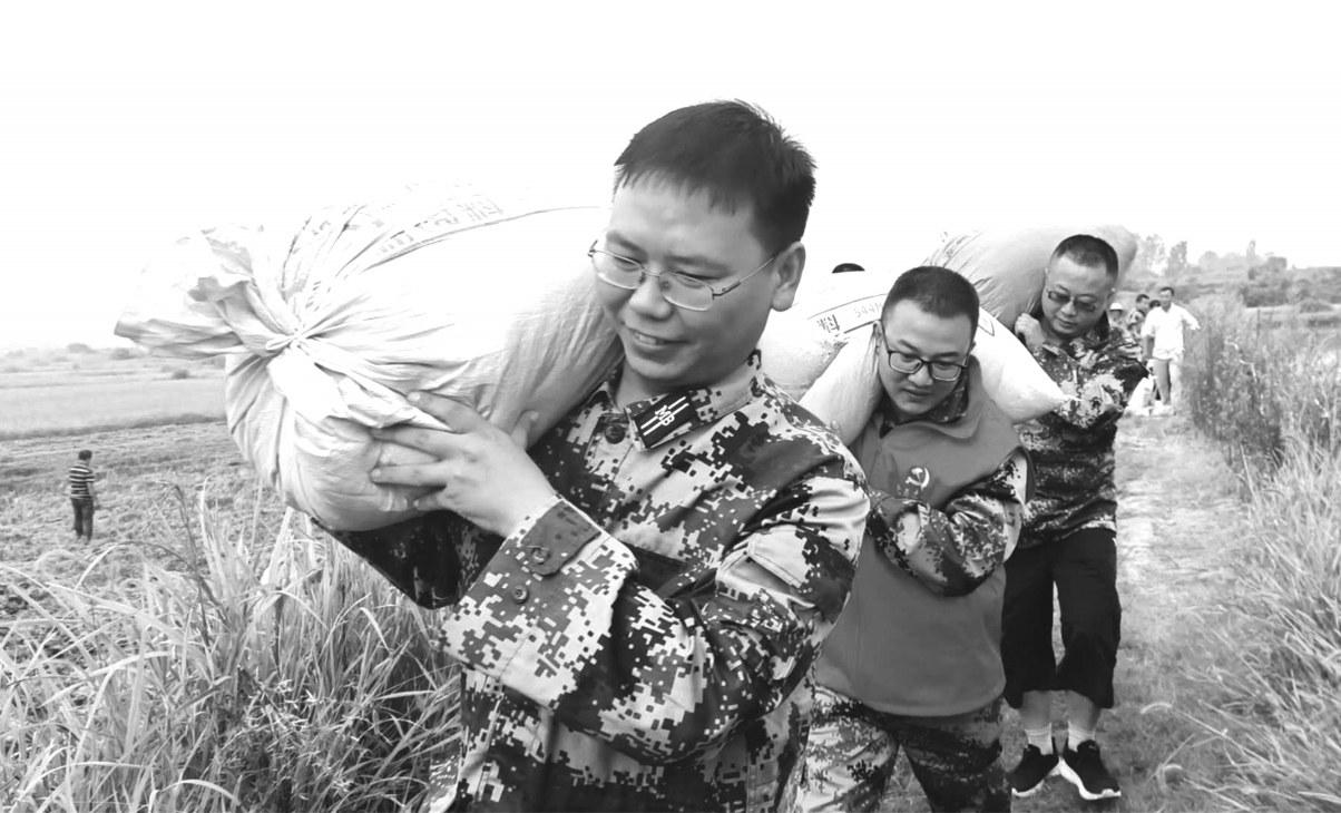 ▲9月6日,商城县司法局双椿铺司法所工作人员来到宋岗村,和群众一起收割稻谷。河南法制报记者杨占伟摄影报道