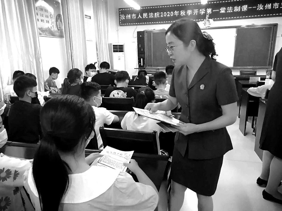 近日,共青团汝州市委联合汝州市法院、市司法局开展“青年普法志愿者法治文化基层行”活动。汝州市法院积极组织优秀法官深入汝州市第五中学开展法治宣传教育,为新入学的初中一年级学生上好开学普法第一课,并为同学们赠送了普法书籍。河南法制报记者陈亚洲通讯员杨松播李亚芳摄影报道