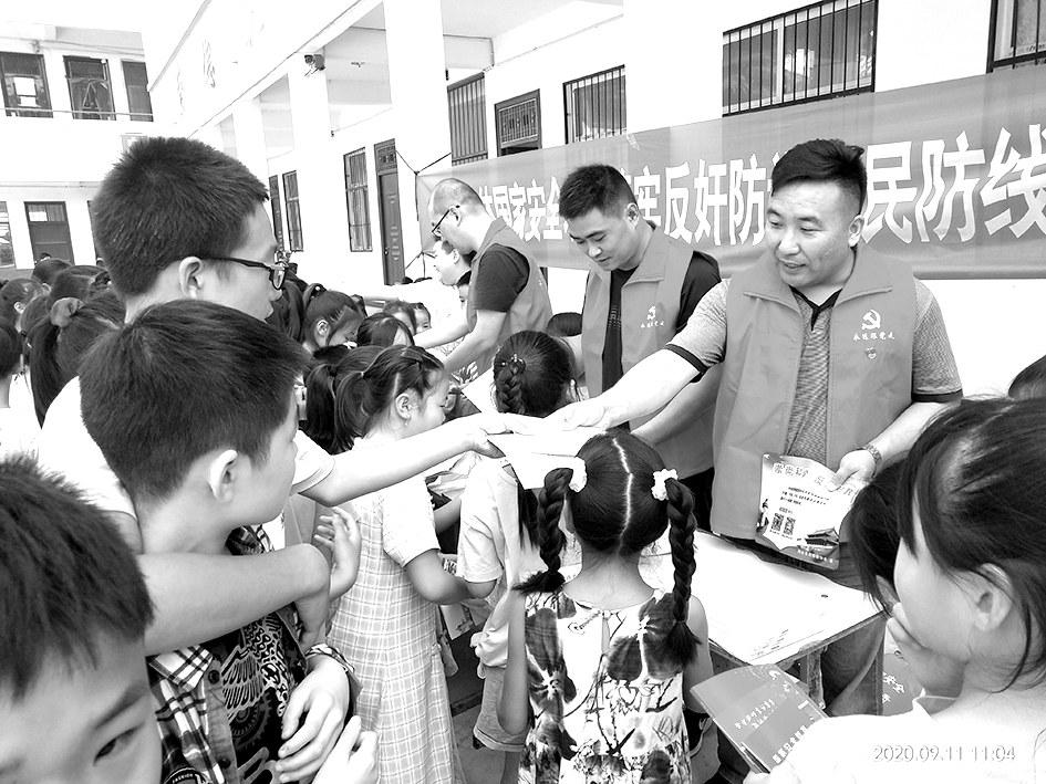 9月11日上午,商水县委政法委的党员志愿者来到该县张明乡龙胜小学,开展法治安全教育活动,进行反邪教宣传,拉开了全县国家安全、反邪教“进学校、进机关、进乡村、进企业、进旅游景点、进军营”常态化宣传活动的序幕。河南法制报记者程玉成 通讯员张校尉摄影报道