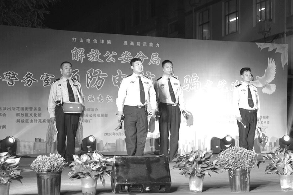 9月26日晚,焦作市公安局解放派出所在华园小区组织开展预防电信诈骗文艺晚会,通过自编自导的文艺节目,切实增强群众对电信网络诈骗的防范意识。 吕静茹摄影报道