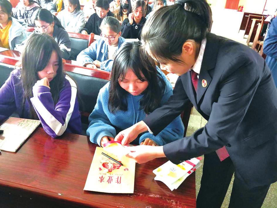 ▲近日,新县检察院组织干警到该县职业高中开展法治宣讲,希望同学们积极学法、守法、用法。检察干警还给该校学生发放法律知识宣传手册、答疑解惑。河南法制报记者杨占伟通讯员余冬梅刘华摄影报道