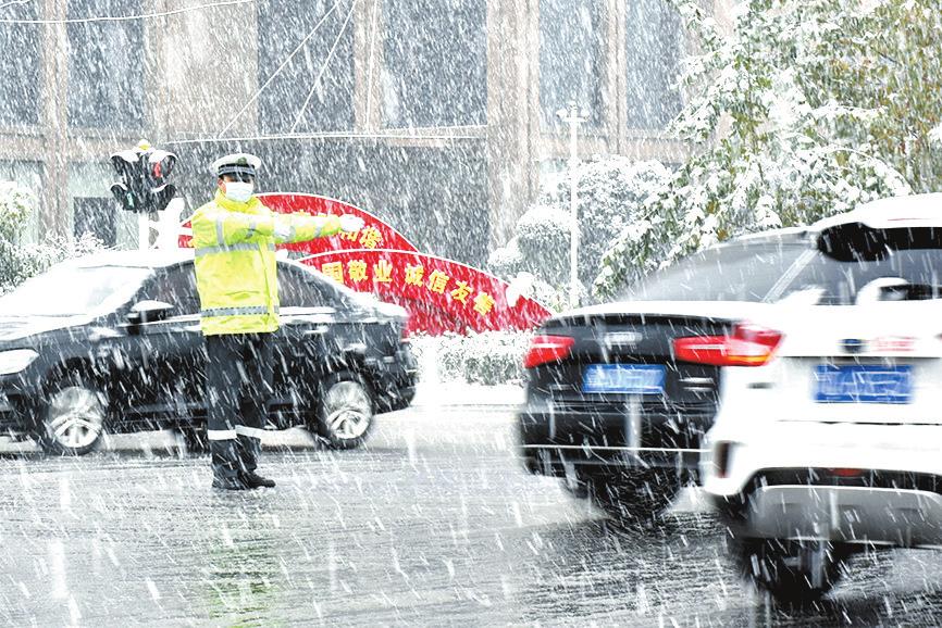 11月23日,新蔡县普降大雪,县公安局交警大队立即启动雨雪天气道路交通应急方案,组织警力指挥疏导交通,提醒群众注意出行安全,全力保障道路平安畅通。