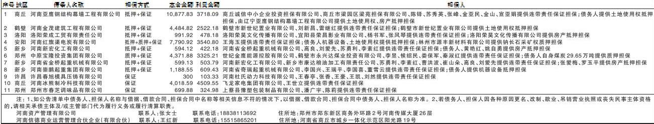 根据河南资产管理有限公司与河南信德商业运营管理合伙企业(有限合伙)达成的债权转让安排,河南资产管理有限公司已将其对公告清单所列债务人及其担保人享有的主债权及担保合同项下的全部权利(包括但不限于担保债权、违约金债权、损失赔偿权、利息债权及转让方已经缴纳的诉讼费、保全费等),依法转让给河南信德商业运营管理合伙企业(有限合伙)。河南资产管理有限公司与河南信德商业运营管理合伙企业(有限合伙)联合公告通知各债务人及担保人以及其他相关各方。 河南信德商业运营管理合伙企业(有限合伙)作为上述债权的受让方,现公告要求下列债务人及其担保人,从公告之日起立即向河南信德商业运营管理合伙企业(有限合伙)履行主债权合同及担保合同约定的还本付息义务或相应的担保责任。 特此公告。 河南资产管理有限公司 河南信德商业运营管理合伙企业(有限合伙) 2020年12月4日 截止2019年8月31日(单位:人民币万元) |