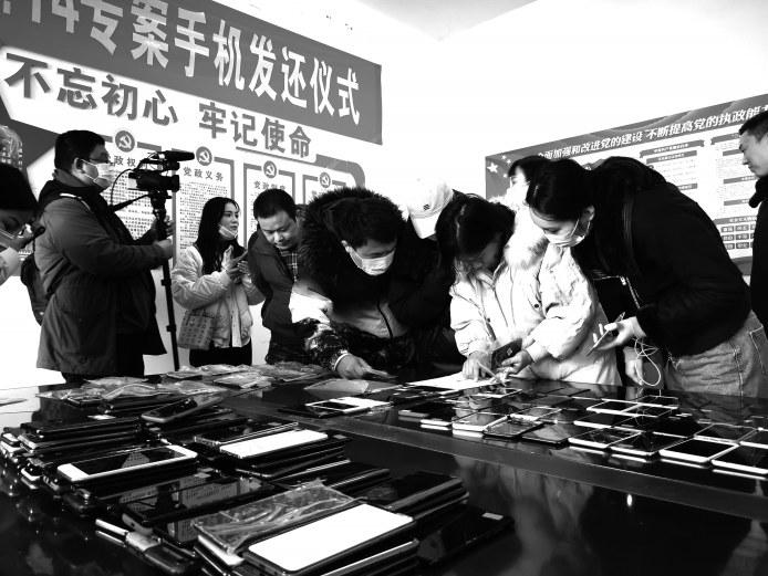 “手机发还仪式现在开始,请大家排队依次确认领取。”近期,郑州市公安局惠济分局刘寨派出所打掉了一个盗销手机团伙,抓获9名盗窃嫌疑人、3名销赃嫌疑人,查获被盗手机近300部。2月27日,刘寨派出所举行“1·14”专案手机发还仪式,向首批经确认的50余名群众发还被盗手机。