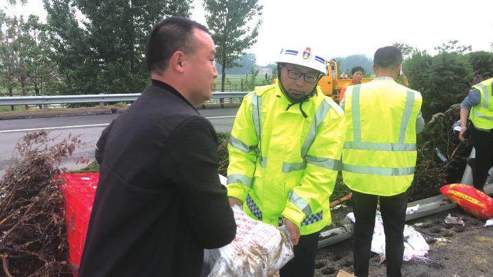 5月3日下午,在商登高速开封市通许县路段,一货车侧翻,车厢内物品散落在高速路上,造成高速拥堵。柘城县公安局皇集派出所天门赵村驻村辅警赵晨河路过时,与中原高速睢县分公司通许路产管理大队、开封高速交警共同展开救助,并用驾驶的货车,把散落的货物送到指定地点。河南法制报记者何永刚通讯员张凯摄影报道