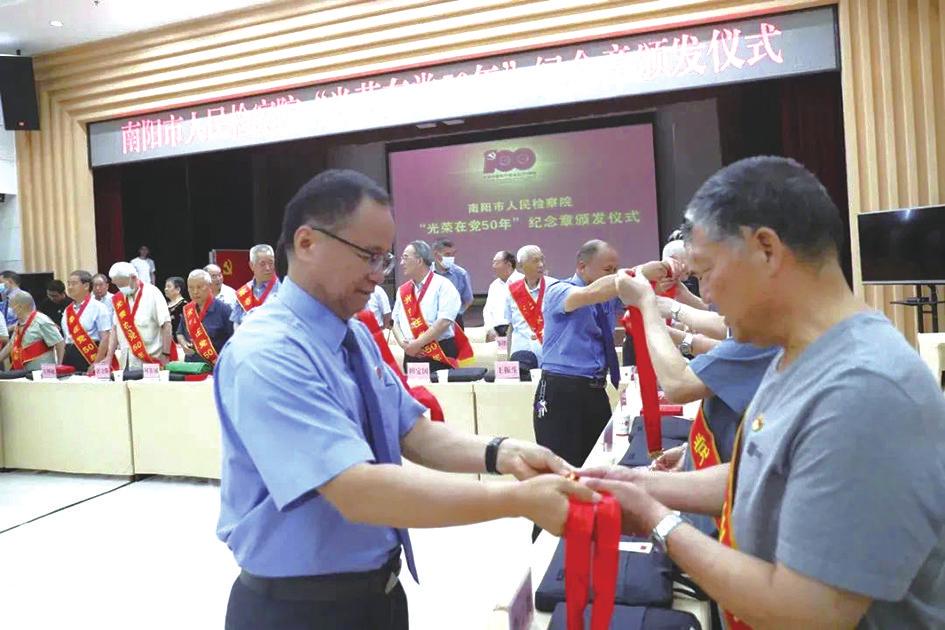 近日,南阳市检察院举行“光荣在党50年”纪念章颁发仪式。该院党组书记、检察长薛长义,党组副书记、常务副检察长张科为36名党龄50年以上的老党员颁发纪念章。 河南法制报记者王海锋实习记者刘震通讯员汪宇堂摄影报道