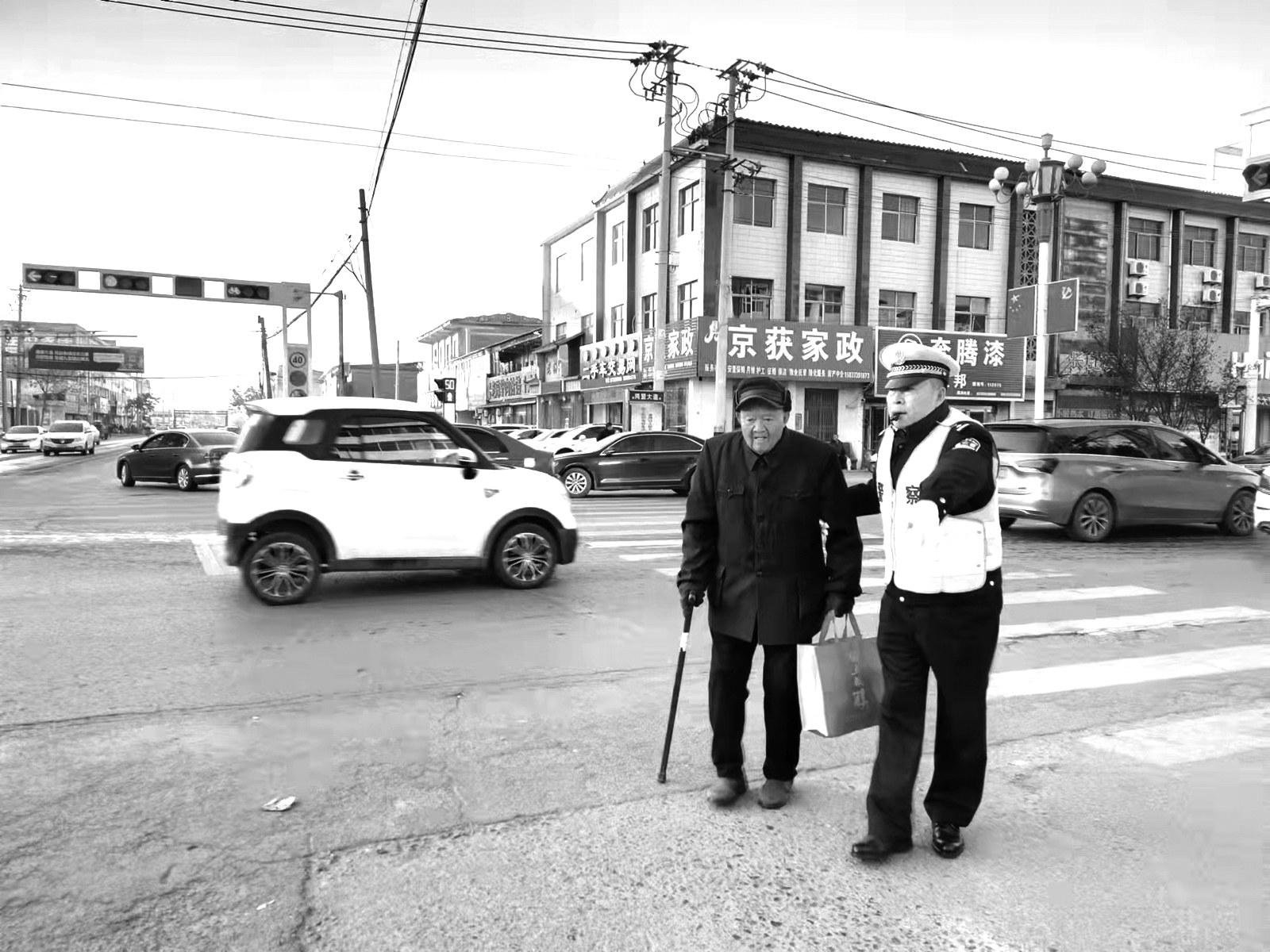 为进一步加大道路交通秩序管理力度,提高街面见警率和管事率,获嘉县公安局全面启动“文明标兵、获警护航”专项行动。图为执勤交警协助行动不便老人过马路。河南法制报记者穆智明通讯员马妍摄影报道