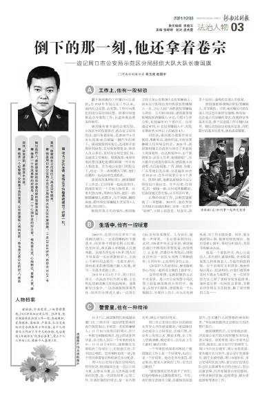 他是一个好警察,办起案子势同雷霆,让犯罪嫌疑人闻风丧胆;他也是大家公认的好人,救助弱残,扶危济困,勇救落水女孩。 他是一个作风果断的好领导,也是一个心细如发的好大哥。他热爱生活,心胸豁达,善解人意,接触过他的人,都能感受到他如沐春风般的温暖和真诚…… 他是周口市公安局示范区分局经侦大队大队长唐国旗。11月28日8时许,在侦办﹃﹄专案时,他晕倒在工作岗位上,再也没有醒来。 他47岁的生命,定格在手持卷宗缓缓倒下的那一刻。 人物档案 唐国旗,中共党员,二级警督警衔,1993年参加公安工作。28年来,他长期奋战在经侦工作一线,忠诚履职,爱岗敬业,高标准、严要求,扎实完成组织交办的各项工作任务,在平凡的岗位上作出了不平凡的业绩,先后连续3年被评为“优秀公务员”,荣立个人三等功1次,荣获个人嘉奖3次。 A工作上,他有一股韧劲 翻开唐国旗的工作履历可以看到,自1993年参加公安工作以来,他担任过巡警、治安警,工作时间最长的岗位是经侦民警。很多时间他都是在专案组工作,长途奔袭办理各种案件。 唐国旗有着丰富的办案经验。示范区分局党委委员、政办室主任刘亮说,他印象最深的,是2020年6月发生的某4S店被骗一辆汽车的案子。唐国旗接到报案后,迅速展开前期研判侦查,在发现案情复杂,牵涉人员众多后,及时向分局党委汇报,迅速成立专案组。根据线索,他和专案民警迅速赶赴濮阳抓捕一号目标人物范某。在当地公安部门的配合下,经过一天一夜的蹲点守候,他们在濮阳一加油站将范某抓获。 连夜将范某押回周口,唐国旗顾不上休息,又同同事一起赶赴贵州,抓捕该案另一个目标人物劳某。从贵州到吉林,再转往深圳,他们一路跟随嫌疑人的脚步,马不停蹄,辗转奔波,最终将犯罪嫌疑人劳某等3人抓获,带回周口。 根据劳某交代的情况,唐国旗立即又奔山东抓捕5名犯罪嫌疑人,回来后立即前往贵州抓获犯罪嫌疑人一名,之后又到广西抓获犯罪嫌疑人两名。几天的时间里,唐国旗带领抓捕组抓获嫌疑人11名,行程3万多公里,足迹遍布13个省市区。后来通过审判,11名犯罪嫌疑人中,判处有期徒刑10年以上的就有4人。 刘亮说,唐国旗办理案件很有韧劲,果断果决,连续作战,不给犯罪嫌疑人任何喘息机会。2021年,唐国旗相继主办或参与侦办了多起重大刑事案件。在这些案件中,由于案情复杂,涉及人员多,地域跨度广,有大量外出侦查办案任务,唐国旗主动请缨,先后赴福建、广西、湖南、安徽、广东等地出差办案,足迹遍及10余省20余市,在外时间累计有3个多月。很多时候,他都是接到命令后立即收拾行装出发。在外办案,住得差,饥一顿饱一顿,长时间风餐露宿,但唐国旗无怨无悔,从不叫苦叫累。 长期的侦查工作,让唐国旗练就了一双慧眼。2019年,他在参加文明城市创建执勤时,发现一名男子“面熟”,立即上前盘查。经查实,该男子是网上通缉的在逃人员郭某。 唐国旗能够准确识别犯罪嫌疑人,并非偶然。日常,他对辖区内的在逃人员信息反复研究揣摩,熟知每一名在逃人员涉嫌的罪名、体貌特征等基本信息,便于在追逃工作中随时运用。辖区宾馆旅店的基本信息、网吧歌厅的基本信息等,他也清清楚楚。 B生活中,他有一腔暖意 2009年,在周口市区青年广场南侧坑塘内,一女孩捞蝌蚪时不慎落水,同伴伸手搭救也掉入坑塘。危急时刻,两名路人相继跳入坑塘相救。坑塘水深处有3米多,两人好不容易将一名女孩推到岸上,正担心不够时间去救另一名落水者时,闻讯赶来的唐国旗已跳入坑塘,将另一名落水者救上岸。 2011年4月6日下午,周口市区街头一名流浪孕妇当街分娩,正在附近的唐国旗立即赶赴现场。他果断发出指令,一边迅速疏散围观男性,组织妇女围成人墙;一边拨打120,告知具体情况。几分钟后,随着一声啼哭,一名女婴来到世间。此时,120救护车还没来到,唐国旗迅速打开携带的单警装备,找到剪刀、止血带、消毒纱布等物品,请附近诊所的一名医生用剪刀剪断脐带,又用纱布、止血带给孕妇止血。 120医护人员赶到后,唐国旗和热心市民一起将母女俩抬上救护车。 这样的事情,在唐国旗的生活中有很多。周口市公安局警令部民警王丽是唐国旗的大学同学。她说,在同学们眼里,唐国旗是一个心胸豁达、乐观向上的人,对生活充满热爱、对工作无限执着。同学、朋友遇到烦心事,都喜欢找他倾诉。他总是耐心倾听,帮助分析情况,共同寻找解决办法。 他是一个善良朴实、热心公益的人,多次到儿童福利院、养老院看望孤儿和孤寡老人,为他们捐款捐物。对于亲朋好友和同事,他始终报以真心、坦诚相待,在他们遇到难处时不遗余力地帮忙。有一位同学因为女儿得了重病导致家庭困难,他听说后第一时间赶去看望,并联系同学朋友为其捐款,解了同学燃眉之急…… C警营里,他有一种精神 11月7日,唐国旗带队到福建省厦门市、三明市对一起经济犯罪案件进行调查取证,并抓获一名犯罪嫌疑人。11月16日夜里回到周口,次日一早做完核酸检测后,他立即进驻西华县,全力投入到另一个专案的侦办中。11月23日8时许,他晕倒在专案组的工作岗位上,经抢救无效,不幸因公殉职。直至牺牲的前一刻,他手里仍拿着卷宗和侦破任务分配表。 周口市公安局示范区分局局长何学民说,唐国旗同志是一名以大局为重、以事业为重、以人民利益为重的好民警,是一名团结同事、忘我工作、乐善好
