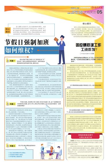 核心提示 家人团聚,欢度佳节,是大家最期盼的事情。如果单位节假日还要求你加班,你会怎么办?如果说“不”,有可能被处罚甚至被开除。企业的做法合法吗?遇到这些问题,该如何维权?对此,河南法制报记者采访了省政协委员、河南砥砺律师事务所主任陈启超。 问题一 单位安排节假日加班,员工是否有说“不”的权利?相关法律是如何规定的?如因拒绝加班而被单位处罚甚至开除,是否合法? 根据我国劳动法、劳动合同法和《国务院关于职工工作时间的规定》等法律法规的规定,用人单位节假日安排员工加班,应当与工会和劳动者协商,不能强制员工加班。所以,员工有权说“不”。并且单位不得因拒绝加班而处罚甚至开除员工。如果遇到这种情况,员工可以向各级工会或者劳动行政部门反映和投诉,或者向劳动人事争议仲裁部门申请仲裁,依法维护自己的合法权益。 但是,根据劳动法第四十二条和《〈国务院关于职工工作时间的规定〉的实施办法》第七条的规定,在一些特殊情形下,用人单位延长员工工作时间,员工不得拒绝。但在这种特殊情形下加班,用人单位应安排补休,或者按照劳动法的规定支付高于劳动者正常工资标准的报酬。这些特殊情形是: (1)不可抗力因素:发生自然灾害、事故或者因其他原因,使人民的安全健康和国家资产遭到严重威胁,需要紧急处理; (2)公众利益需要:生产设备、交通运输线路、公共设施发生故障,影响生产和公众利益,必须及时抢修的; (3)设备检修保养:必须利用法定节日或公休假日的停产期间进行设备检修、保养的; (4)国防紧急任务:为完成国防紧急任务,或者完成上级在国家计划外安排的其他紧急生产任务,以及商业、供销企业在旺季完成收购、运输、加工农副产品紧急任务的; (5)无法间断生产:在法定节日和公休假日内工作不能间断,必须连续生产、运输或营业的。 问题二 节假日加班,应按照正常工资的3倍支付加班工资,这个法律概念现在知晓率比较高,但不少用人单位并没有落实,员工应该如何维权?法律依据有哪些? 节假日加班,应按照正常工资的3倍支付工资,但需明确一下具体规定: 我国实行劳动者每日工作时间不超过八小时、平均每周工作时间不超过四十四小时的工时制度。用人单位应当保证劳动者每周至少休息一日。用人单位由于生产经营需要,经与工会和劳动者协商后可以延长工作时间,一般每日不得超过一个小时;因特殊原因需要延长工作时间的,在保障劳动者身体健康的条件下,延长工作时间每日不得超过三个小时,每月不得超过三十六个小时。 劳动法第四十四条规定:“有下列情形之一的,用人单位应当按照下列标准支付高于劳动者正常工作时间工资的报酬:(一)安排劳动者延长时间的,支付不低于工资的百分之一百五十的工资报酬;(二)休息日安排劳动者工作又不能安排补休的,支付不低于工资的百分之二百的工资报酬;(三)法定休假日安排劳动者工作的,支付不低于工资的百分之三百的工资报酬。” 根据《全国年节及纪念日放假办法》的规定,正月初一、初二、初三是法定节假日;其他四天是调休时间。用人单位若安排员工加班,初一至初三,应支付不低于工资的百分之三百的工资报酬;除夕、正月初四至初六是休息日,用人单位安排劳动者工作又不能安排补休的,支付不低于工资的百分之二百的工资报酬。 如果用人单位没有落实春节假期加班待遇,安排员工加班而未按规定支付加班工资的,根据劳动合同法第八十五条的规定,由劳动行政部门责令限期支付劳动报酬、加班费或者经济补偿;逾期不支付的,责令用人单位按应付金额百分之五十以上百分之一百以下的标准向劳动者加付赔偿金。 员工可以通过哪些途径维权? (1)向工会反映要求予以解决;(2)向劳动行政部门投诉;(3)申请仲裁、提起诉讼。 |