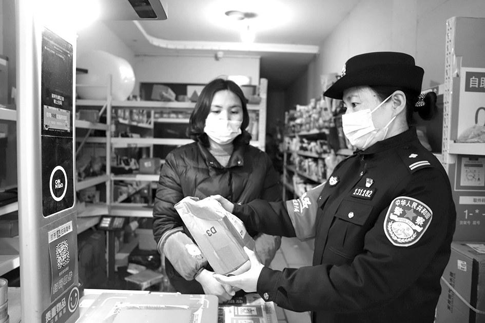 针对当前严峻复杂的疫情防控态势,3月25日,安阳市公安局北关分局坚持“人物同防”,严格落实闭环管理措施,把好外防输入关,对辖区87个物流寄递公司营业点开展疫情隐患排查。图为民警在快递点了解包裹消毒情况,并向快递服务营业部工作人员宣讲 防疫知识。