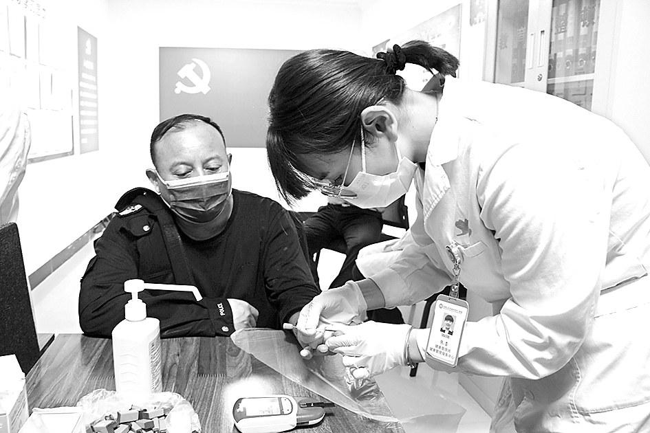 近日,由郑州市公安局中原分局和郑州市中心医院联合组成的医疗巡诊小组,深入中原分局建设路派出所开展“健康随警行,送诊到一线”活动,为长期奋战在基层一线的民警、辅警提供上门巡诊、健康监测服务。河南法制报记者宁晓波通讯员闫青青摄影报道