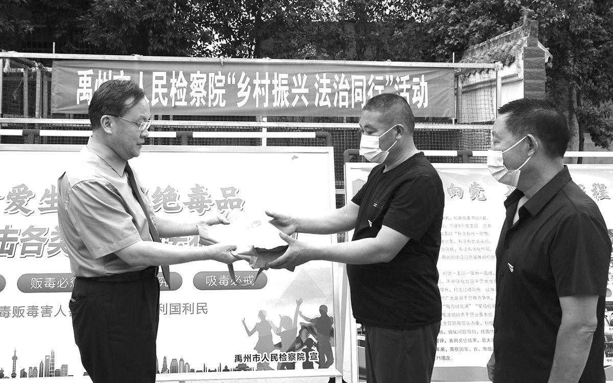 7月19日,禹州市检察院政治部、综合业务部干警,到该市鸿畅镇杨河村开展结对帮创志愿服务活动,为该村群众送上识毒、防毒、拒毒“法治大礼包”。