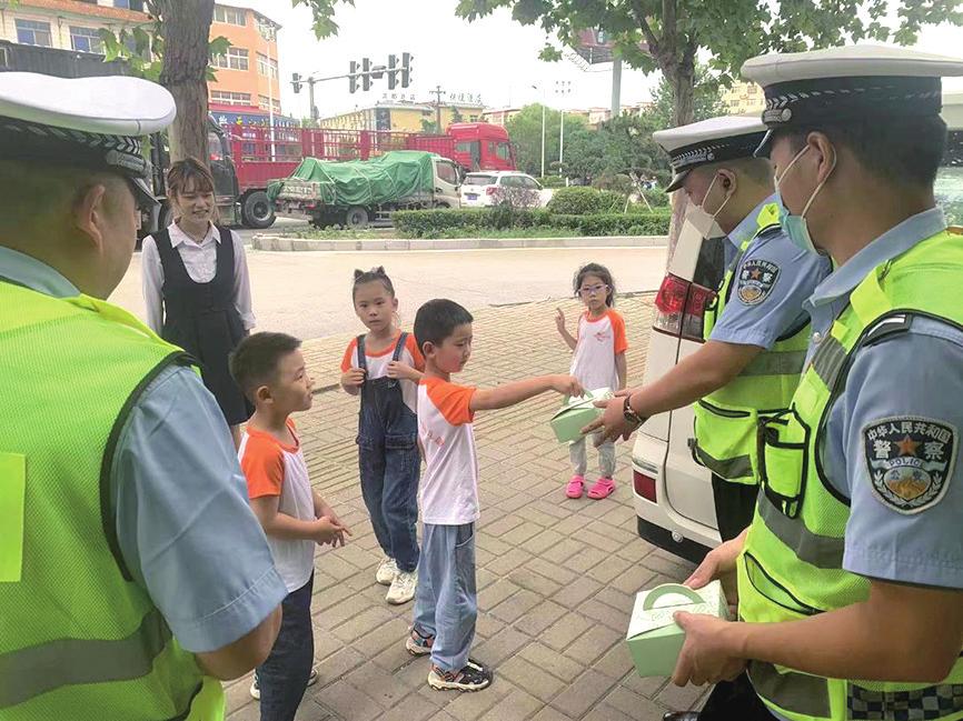 “交警叔叔,你们辛苦了,祝你们中秋节快乐!”9月9日,在临颍县公安局交警大队南街中队岗亭,4名幼儿园小朋友在老师的陪伴下,为正在执勤的交警送上月饼,感谢他们辛勤工作。曹娟杨勇摄