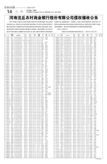 河南沈丘农村商业银行股份有限公司债权催收公告