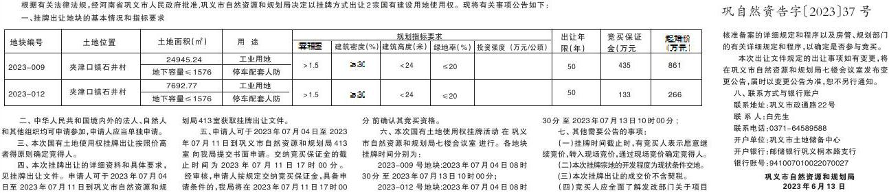 巩义市自然资源和规划局国有土地使用权挂牌出让公告