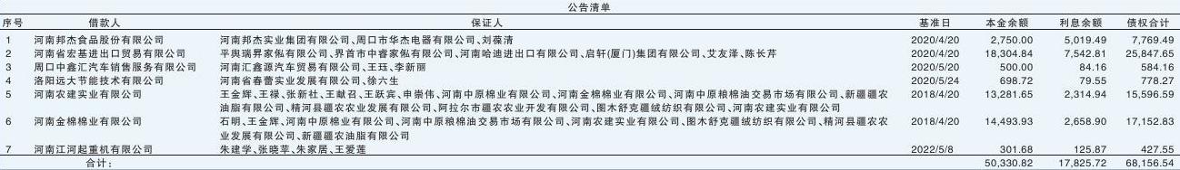 根据中原资产管理有限公司(以下简称“中原资产”)与河南中控发展有限公司达成的《资产转让协议》,中原资产已将其对下列公告清单所列借款人及其担保人享有的主债权及担保合同项下的全部债权(包括但不限于抵债协议、还款协议和其他相关协议以及担保债权、违约金债权、损失赔偿权、利息债权、转让方已经缴纳的诉讼费、保全费等项下的全部权利)依法转让给了河南中控发展有限公司。中原资产与河南中控发展有限公司特公告通知各借款人、担保人以及其他相关各方,自公告之日起立即向河南中控发展有限公司履行还本付息义务或承担相应的担保责任。 河南中控发展有限公司作为下列债权的受让方,现公告要求公告清单所列借款人及其担保人(含相关承债主体、清算主体),自公告之日起立即向河南中控发展有限公司履行主债权合同及担保合同约定的还本付息义务或承担相应的担保责任。特此公告。(单位:人民币/万元) 中原资产管理有限公司 河南中控发展有限公司 2023年12月14日 中原资产联系方式: 地址:郑州市郑东新区龙湖金融岛中环路4号19号楼中原资产大厦 联系人:雷先生电话:0371-61779618 河南中控发展有限公司联系方式: 地址:周口市文昌大道东段招商大厦22楼 联系人:杜先生电话:18939410350 联系人:张先生电话:18238911688 注:1.本公告清单列示各债权基准日的贷款本金、利息余额。借款人和担保人(含相关承债主体、清算主体)应支付给河南中控发展有限公司的债务金额按借款合同、担保合同、抵债协议、还款协议和其他相关协议及中国人民银行的有关规定或生效法律文书确定的方法计算;已经进入诉讼程序并已由中原资产垫付的应由借款人及/或担保人、承债主体、清算主体负担的诉讼费、律师费等以有关法律文书确定的金额为准。2.若借款人、担保人因各种原因更名、改制、歇业、吊销营业执照或丧失民事主体资格的,请相关承债主体及/或主管部门代为履行义务或履行清算责任。3.下列主债务人、担保人如有疑问,请与中原资产或河南中控发展有限公司联系。4.本公告如有漏登、错登,以实际债权凭证为准。 |