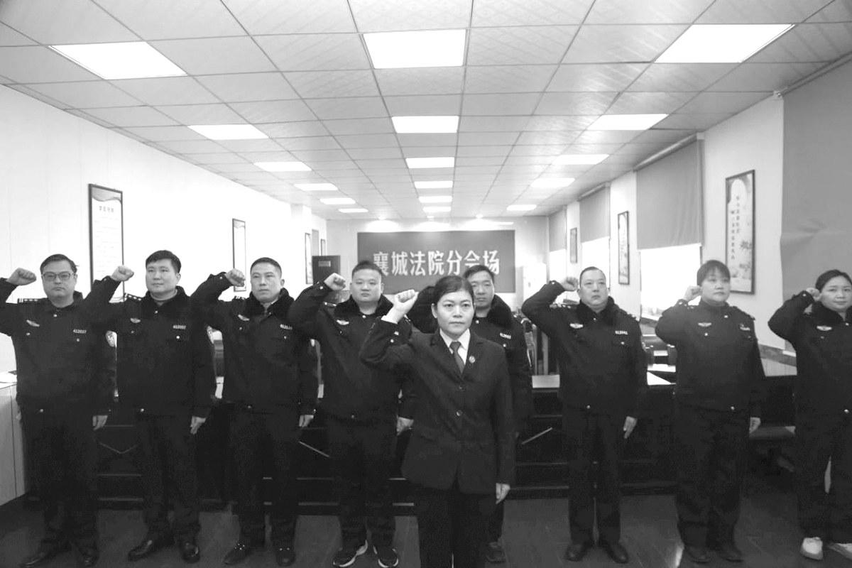 1月8日,襄城县法院司法警察整齐列队,面向警旗,高举右拳,以饱满的精神,向警旗宣誓,并奏唱《人民法院司法警察之歌》。铿锵的誓词,展现了每一名司法警察对党忠诚、服务人民、执法公正、纪律严明的坚定决心。