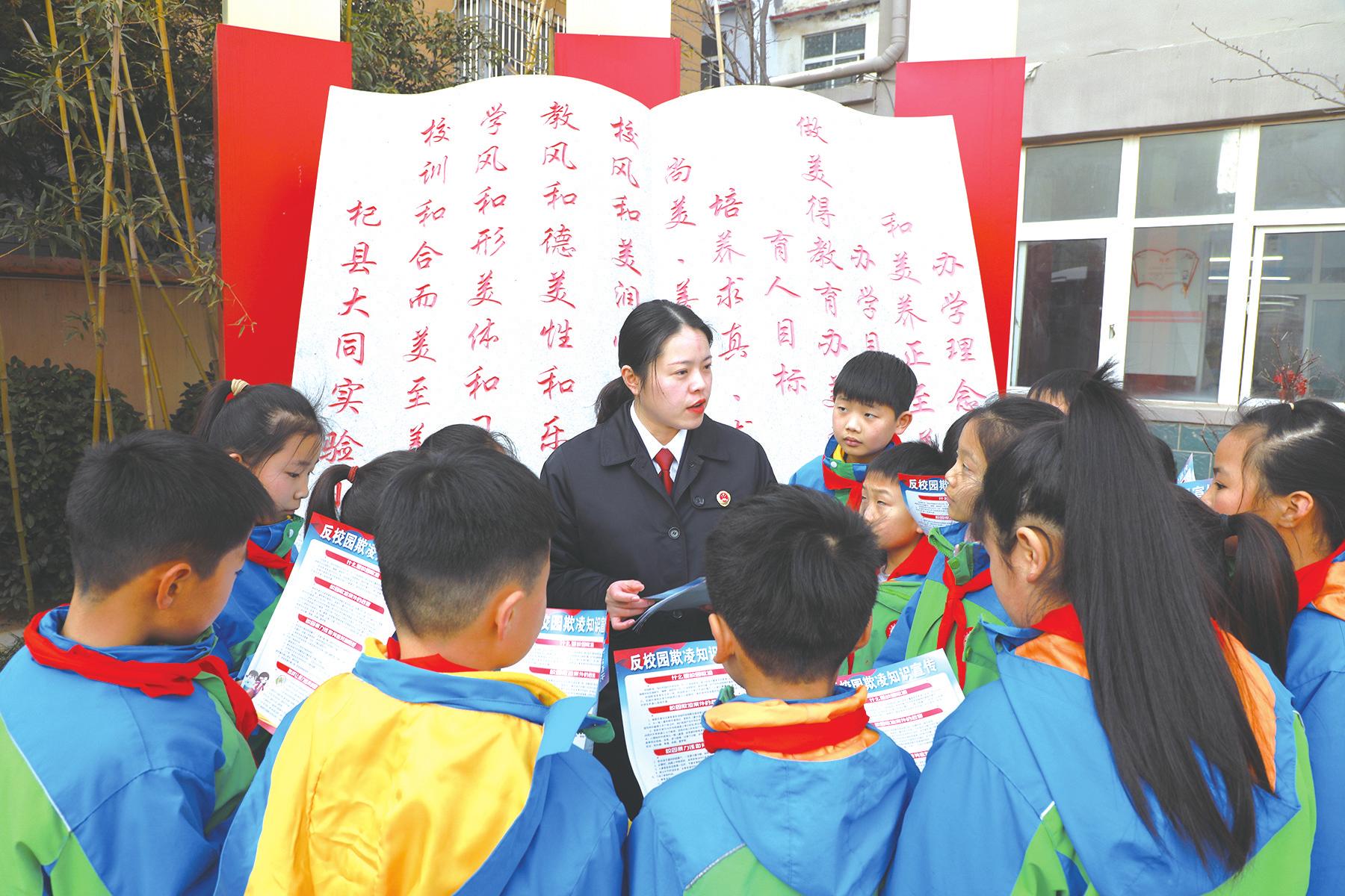 1月10日,杞县检察院检察官走进大同实验小学开展“送法进校园”活动。活动中,检察官贴近青少年生活实际,将杜绝校园暴力、防止校园欺凌、预防性侵害、防范电信诈骗、防止沉迷网络游戏等常识融入到一个个依据真实案例改编的小故事中,让学生通过互动式、启发式学习法律知识。
