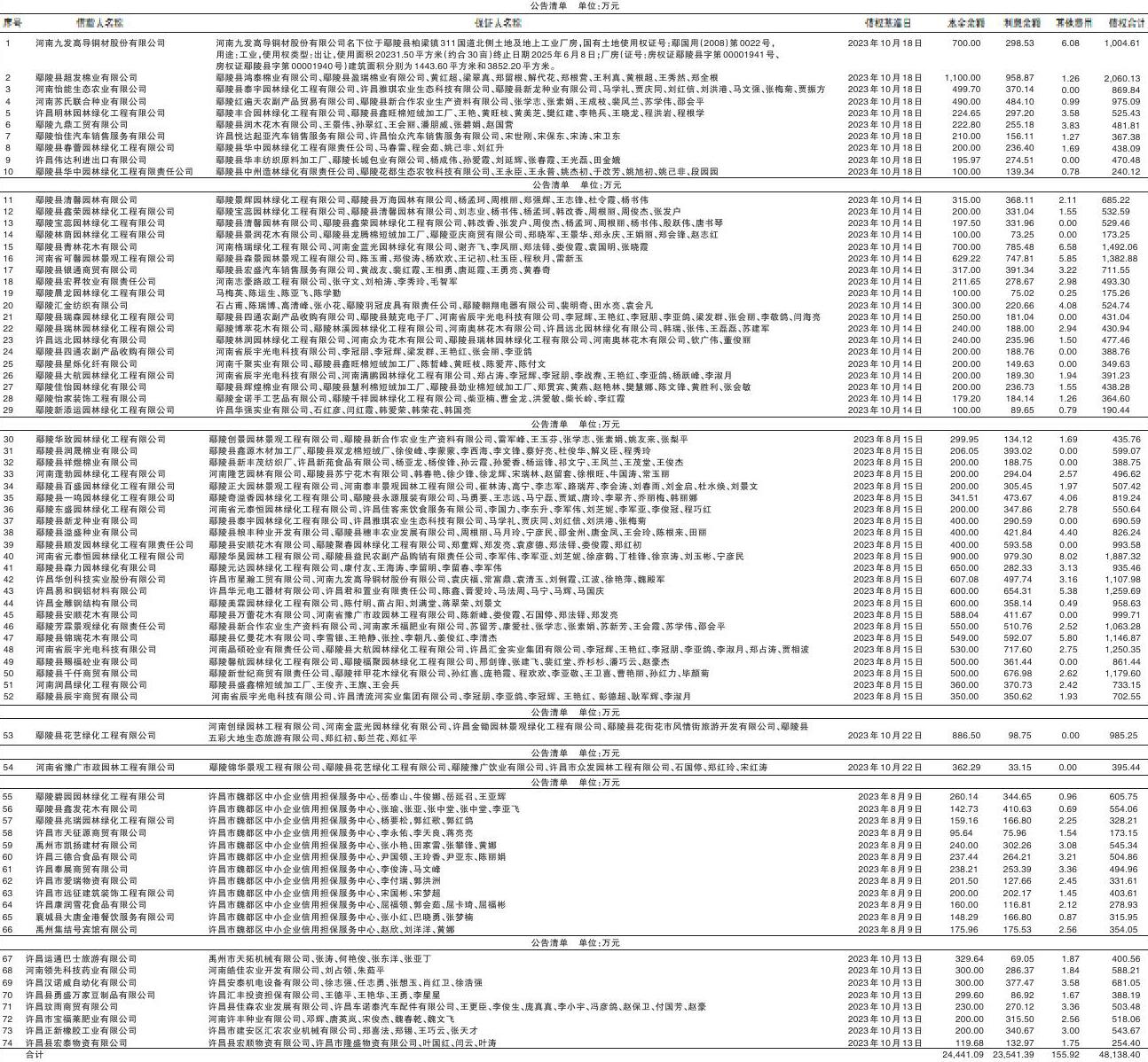 根据中原银行股份有限公司许昌分行(下称“中原银行”)与中原资产管理有限公司达成的《债权转让协议》,中原银行将其对下列公告清单所列借款人及其担保人享有的主债权及担保合同项下的全部债权(包括但不限于抵债协议、还款协议和其他相关协议以及担保债权、违约金债权、损失赔偿权、利息债权、转让方已经缴纳的诉讼费、保全费等项下的全部权利)依法转让给了中原资产管理有限公司。中原银行与中原资产管理有限公司特公告通知各借款人、担保人以及其他相关各方,自公告之日起立即向中原资产管理有限公司履行还本付息义务或承担相应的担保责任。 中原资产管理有限公司作为下列债权的受让方,现公告要求公告清单所列借款人及其担保人(含相关承债主体、清算主体),自公告之日起立即向中原资产管理有限公司履行主债权合同及担保合同约定的还本付息义务或承担相应的担保责任。 特此公告 中原银行股份有限公司许昌分行 中原资产管理有限公司 2024年1月15日 中原银行联系方式: 地址:河南省许昌市建安大道东段 联系人:张先生电话:0374-2696166 中原资产联系方式: 地址:郑州市郑东新区龙湖金融岛中环路4号19号楼中原资产大厦 联系人:黄先生电话:0371-61777575 注:1.本公告清单列示各债权基准日的贷款本金、利息余额。借款人和担保人(含相关承债主体、清算主体)应支付给中原资产管理有限公司的债务金额按借款合同、担保合同、抵债协议、还款协议和其他相关协议及中国人民银行的有关规定或生效法律文书确定的方法计算;已经进入诉讼程序并已由中原资产垫付的应由借款人及/或担保人、承债主体、清算主体负担的诉讼费、律师费等以有关法律文书确定的金额为准。 2.若借款人、担保人因各种原因更名、改制、歇业、吊销营业执照或丧失民事主体资格的,请相关承债主体及/或主管部门代为履行义务或履行清算责任。 3.下列主债务人、担保人如有疑问,请与中原银行或中原资产管理有限公司联系。 4.本公告如有漏登、错登,以实际债权凭证为准。 |