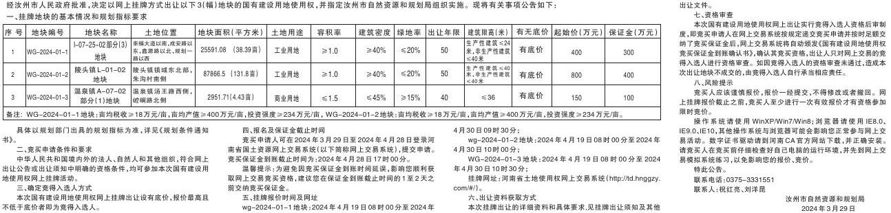 汝州市国有建设用地使用权出让网上挂牌公告(汝自然资网挂〔2024〕01号)