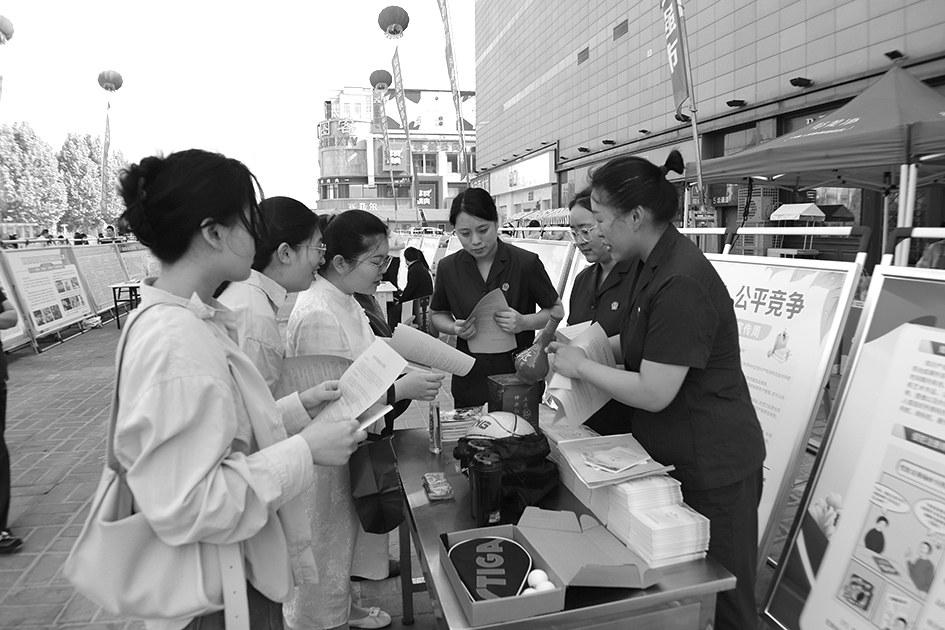 4月26日,鹤壁市中级法院组织干警参加全市知识产权宣传周活动,加强知识产权保护宣传教育。图为该院干警耐心解答群众问题,积极回应群众法治需求。