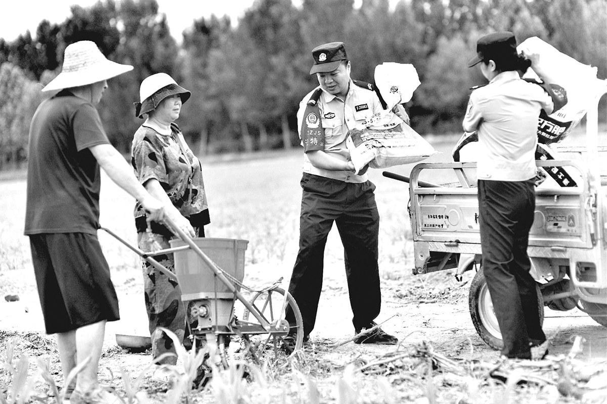 近日,郑州市公安局金水分局巡特警队员们顶着高温,深入辖区马渡村的田间地头,一边宣传防诈骗知识,一边助力农民农田施肥和抗旱保苗。 河南法制报记者宁晓波通讯员刘书亭张爱凡摄影报道