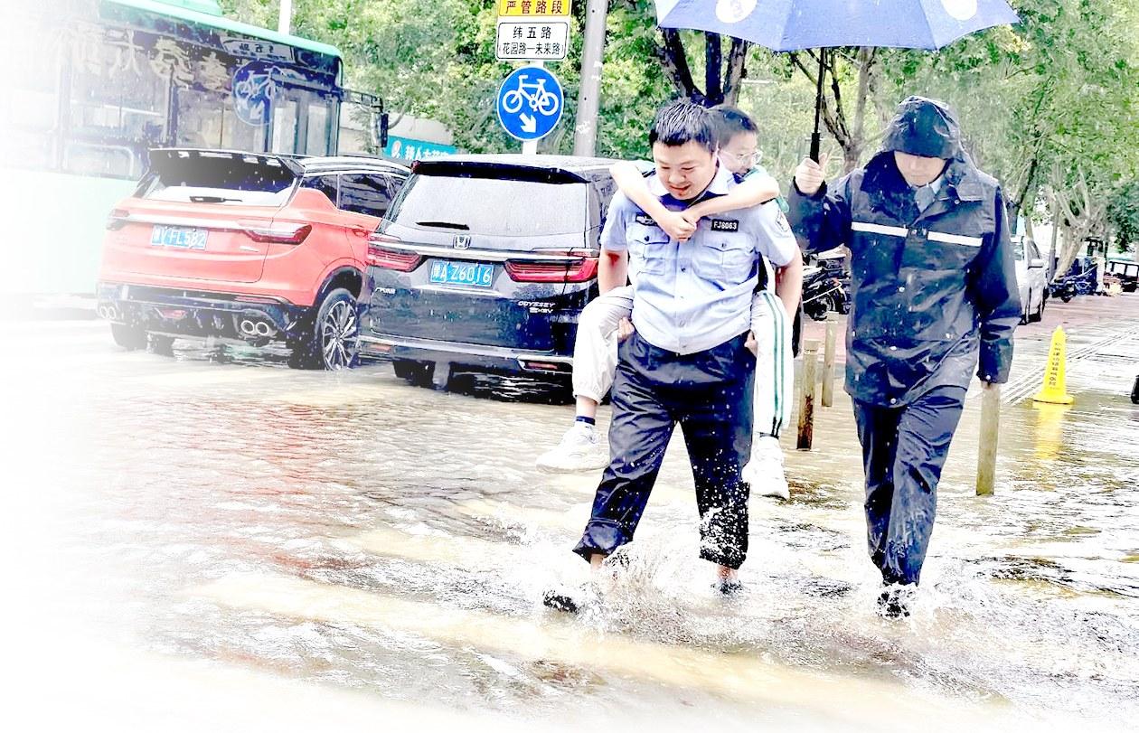 近日,郑州市区频繁降雨,郑州市公安局金水巡特警大队持续开展防汛警务行动,深入辖区易积水路段排查隐患,切实保障辖区群众出行安全。图为该大队队员背小朋友过马路。