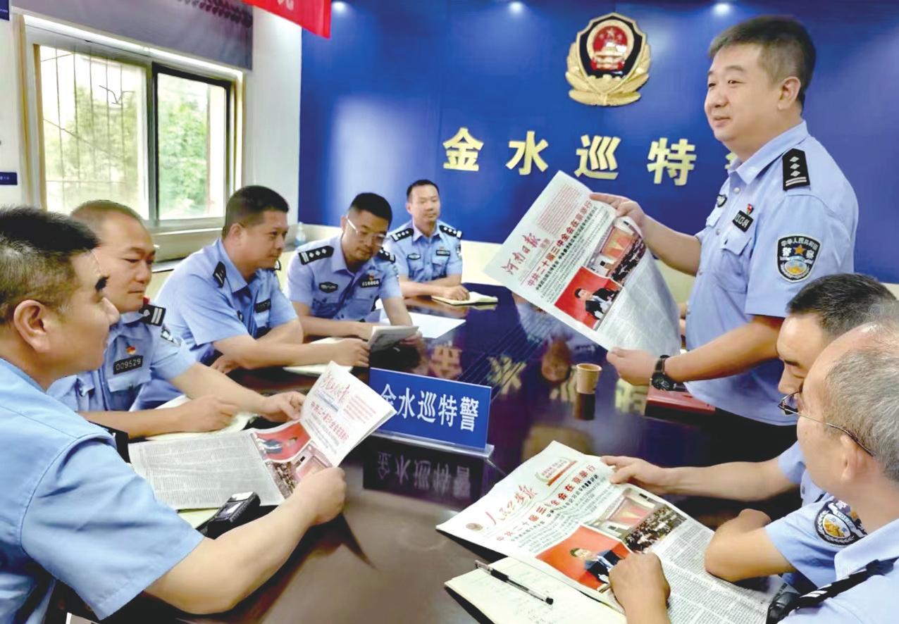 7月19日上午,郑州市公安局金水分局巡特警大队组织部分民警辅警认真学习领会党的二十届三中全会精神。民警纷纷表示,要以全会精神为指引,用实际行动筑牢安全屏障,持续提升人民群众的获得感、幸福感。