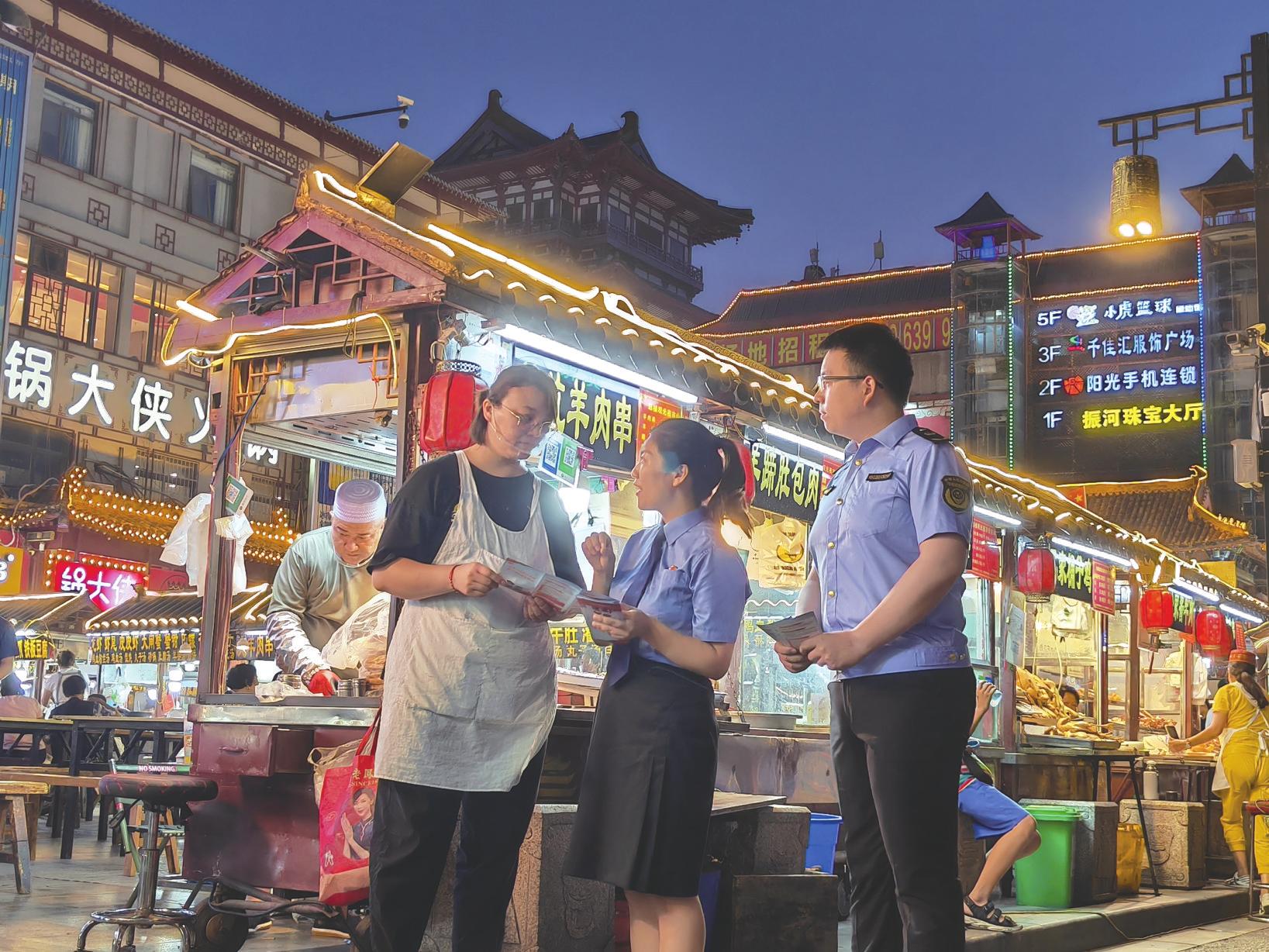7月23日晚,开封市鼓楼区检察院干警联合区市场监督管理局工作人员走进鼓楼夜市,开展食品安全宣传活动,向游客、商户普及食品安全、老字号知识产权保护等法律知识。河南法制报记者张东实习生李梦华摄影报道