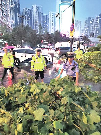 7月24日,暴雨天气来袭,洛阳市涧西区西苑路太原路口一棵大树被拦腰刮断,洛阳市公安局交警支队一大队迅速组织民警辅警雨中疏导交通,清理障碍,维护道路通行秩序。徐冰摄