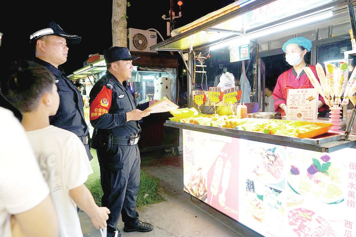 近日,民权县公安局组织民警辅警开展消夏巡逻检查,加大广场、商圈及人员密集场所的巡逻防控力度,全力护航“夜经济”,守护城市“烟火气”。图为该局特巡警向群众讲解反诈知识。