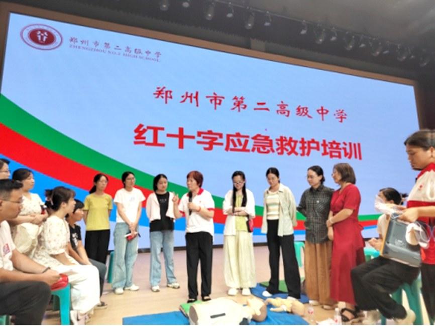 8月15日,郑州市第二高级中学邀请郑州市红十字会培训中心主任郑建梅一行,到校开展“2024年高途公益应急救护培训项目救护员(初级)培训”,培训内容涵盖了心肺复苏、AED使用、海姆立克急救法、骨折的处理、外出血的包扎等。 何雪伟 摄