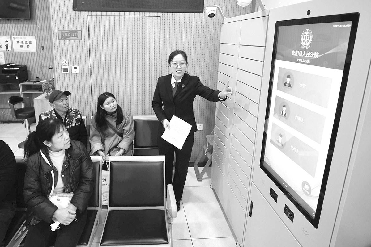 为深入拓展信息化便民诉讼服务新举措,安阳县法院专门引进“智能云柜”,方便群众寄存诉讼材料,通过自动发出的提醒短信收取码,直接通知办案法官领取材料,既减轻了当事人诉累,又提高了审判质效。图为11月4日,该院诉讼服务大厅干警向来院办事的群众讲解“智能云柜”的使用方法。