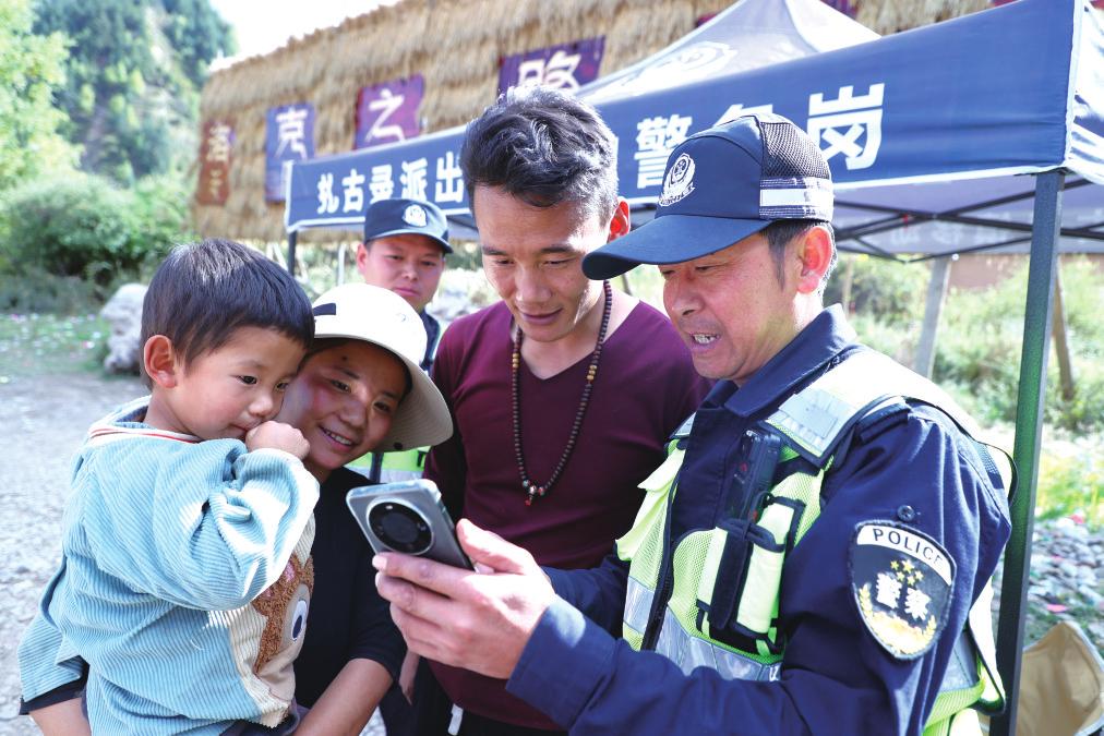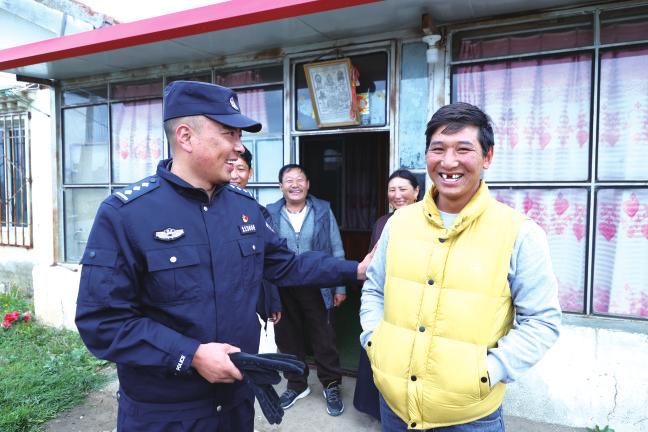 10月10日,在四川省阿坝藏族羌族自治州若尔盖县唐克镇,唐克派出所民警彭措易云走访居住在黄河边的村民。
