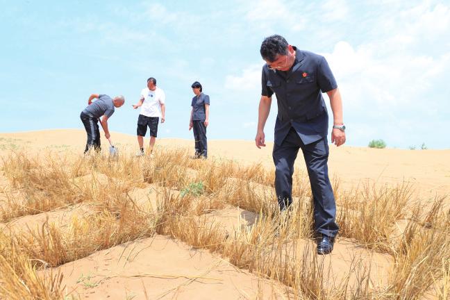 7月10日,宁夏银川铁路运输法院干警组织因破坏生态环境被判处缓刑人员扎草方格,让破坏生态者变为生态保护者。