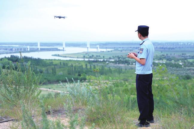 7月11日,宁夏银川市公安局滨河新区分局民警在用无人机巡查黄河河道和滩区。
