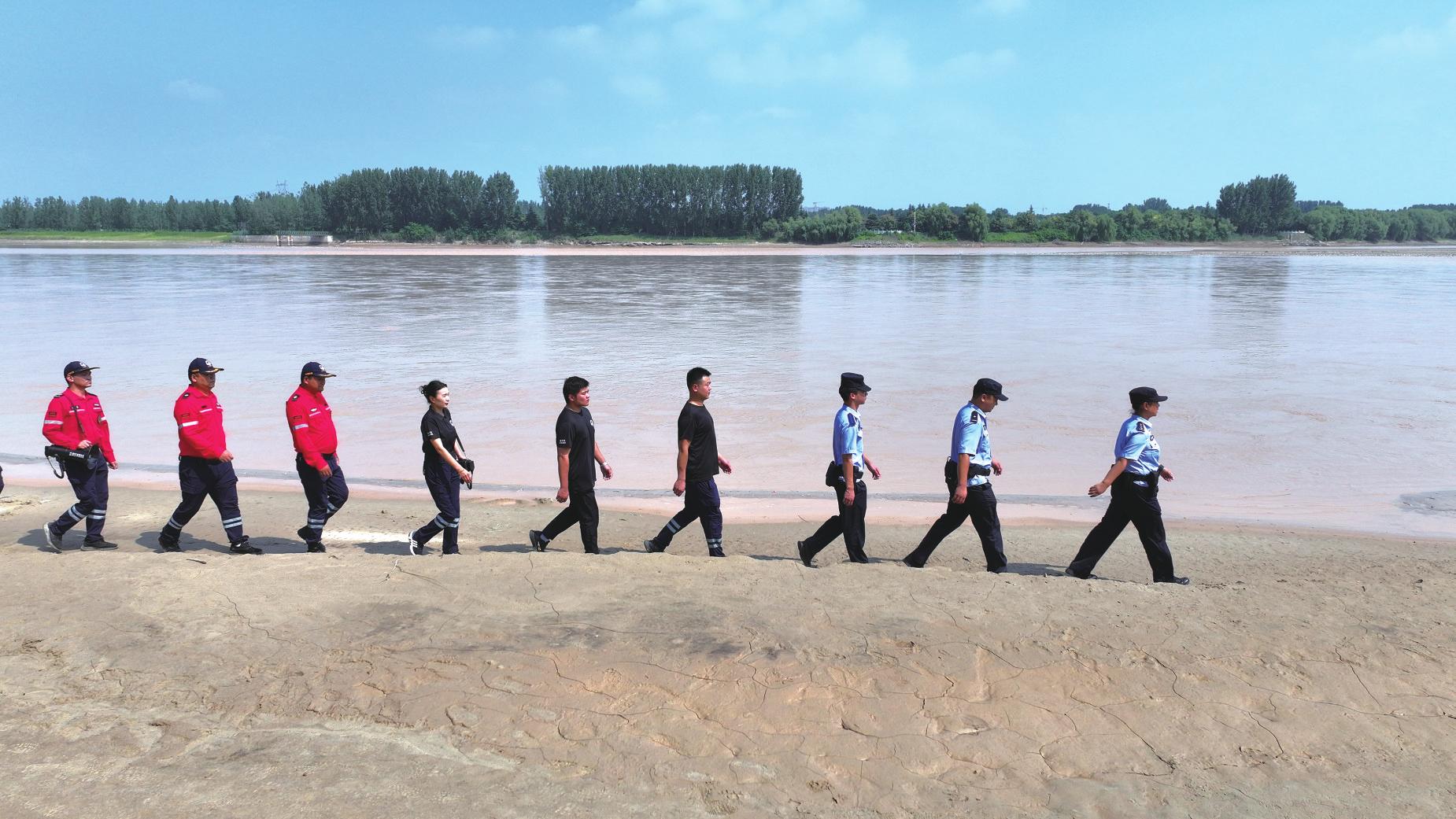 8月20日,河南省洛阳市公安局孟津分局白鹤派出所民警带领义警在黄河边巡逻。