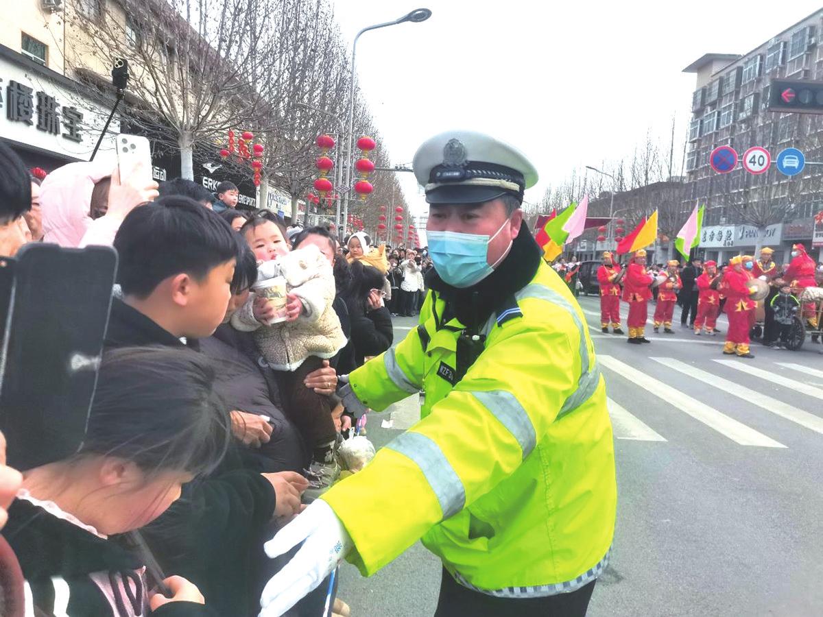 2月12日,武陟县举办元宵节文艺会演活动,县公安局交警大队科学安排警力疏堵保畅。图为民警在辖区路面维护交通秩序。 文立新摄
