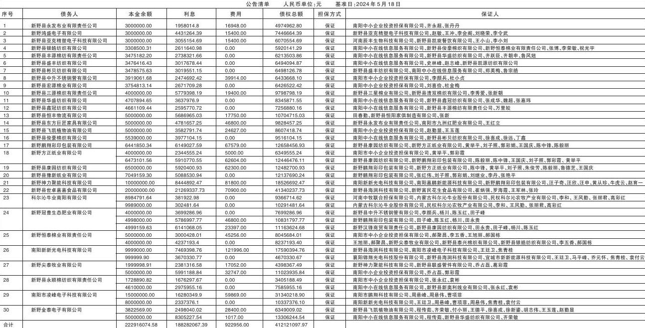 根据河南资产管理有限公司与新野县国控资产运营有限公司签署的《债权转让合同》(合同编号:【HNZC-业务(2025)012】),河南资产管理有限公司已将其对下列债务人及其担保人享有的主债权及担保合同项下的全部权利(具体债权情况最终以借据、合同、法院判决书、调解书、裁定书、相关部门产权登记等有关法律文书为准),依法转让给新野县国控资产运营有限公司。河南资产管理有限公司与新野县国控资产运营有限公司联合公告通知各债务人、担保人以及其他相关义务人。 新野县国控资产运营有限公司作为上述债权的受让方, 现公告要求公告清单中所列包括但不限于借款人、担保人、其他相关义务人及其承债主体、清算主体等,从公告之日起立即向新野县国控资产运营有限公司履行主债权合同、担保合同及其他相关合同约定的偿付义务或相应的担保责任及其他责任等。 特此公告。 河南资产管理有限公司 联系人:李先生 联系电话:17838360616 联系地址:河南自贸试验区郑州片区(郑东)金融岛中环路21号 新野县国控资产运营有限公司 联系人:樊先生 联系电话:15037736709 联系地址:河南省南阳市新野县河园路金成标准化厂房A7号楼 河南资产管理有限公司 新野县国控资产运营有限公司 2025年2月28日 注:1.本公告清单列示截至基准日的债权本金余额、利息余额、费用,基准日后债务人和担保人应支付的利息、违约金、相关费用等按照相关合同协议、生效法律文书及法律法规的规定计算。 2.若债务人、担保人及其他相关义务人因各种原因更名、改制、歇业、吊销营业执照或丧失民事主体资格的,请相关承债主体及/或主管部门代为履行义务或履行清算责任。 3.清单中的“担保人及其他义务人”包括但不限于抵押人、出质人、保证人、差补义务人等。 4.本公告清单列示的金额由于计算方法等原因与实际金额可能存在较大误差,具体以相关合同协议及有效法律文书计算为准。 5.本公告如有漏登、错登,以实际债权凭证为准。 |