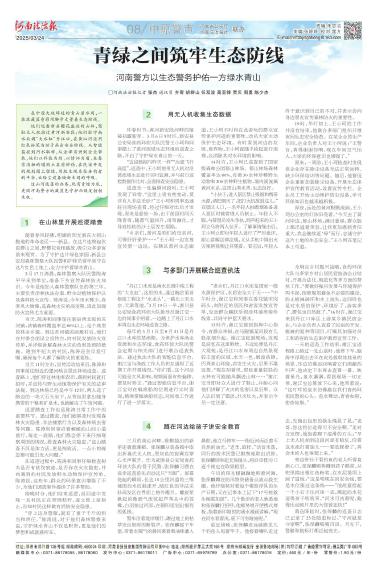 在中原大地绵延的青山碧水间,一抹抹藏蓝身影用脚步丈量着生态防线。 他们巡查新县樱花盛放的山林,驾驭无人机掠过黄河新安段;他们驻守南水北调“大水缸”丹江口,在黄沁河边用红色粉笔为孩子画出安全防线。从智能监控到河水取样,从法律宣讲到企业帮扶,他们以科技为剑、以情怀为盾,在春雪消融的塌陷土层前辨伪,在民宿开发的规划图上留绿,用救生绳系住垂钓者的平安,让除尘设备焕新车间的呼吸。 这山河泼墨的画卷,既有青绿为底,更因河南警方的藏蓝色守护而焕发勃勃生机。 1在山林里开展巡逻踏查 随着春风轻拂,明媚的阳光洒在大别山腹地的革命老区——新县。在这片连绵起伏的群山之间,野樱花竞相盛放,吸引众多游客前来观赏。为了守护这片绿色家园,新县公安局森林警察大队民警和护林员常年坚守在这片红色土地上,全力守护着绿水青山。 3月17日清晨,森林警察大队民警陈涛早早来到单位,准备下乡宣传森林防火知识。今年是他加入森林警察队伍的第三年,主要负责涉林执法办案、野生动植物保护以及森林防火宣传。陈涛说,今年雨水稀少,春季风大物燥,是森林火灾的高发期,因此加强防火宣传尤为重要。 当天,陈涛和同事前往新县西北部的苏河镇,该镇森林覆盖率达80%以上,是个典型的林业乡镇。到达苏河镇的庙墩村后,他们在村委会前设立宣传台,向村民发放防火宣传单,并详细讲解森林火灾的危害及预防措施。遇到年纪大的村民,陈涛还会反复叮嘱,确保每个人都了解防火的重要性。 当天11时左右,宣传活动结束后,陈涛和同事前往附近的墨河峡谷景区林场巡查。巡查路上,他们穿过林地和农田,遇到村民就打招呼,并宣传与野生动植物保护有关的法律法规。到达林场已经是中午12时,两人选了路边的一块大石头坐下,从背包里拿出随身携带的干粮和矿泉水,也就解决了午饭问题。 巡逻踏查工作也是陈涛日常工作中的重要环节。通过踏查,他们能够及时发现森林火灾隐患、非法捕猎行为以及森林病虫害等问题。陈涛和同事沿着蜿蜒的山间小道前行,每走一段路,他们都会停下来仔细观察周围的情况,排查森林火灾隐患。“巡山踏查不仅是体力活,更是细致活。一点小的疏忽都可能引发大问题。” 在巡逻过程中,陈涛和同事仔细检查树木是否有砍伐痕迹,是否存在火灾隐患,并向遇到的村民发放野生动物保护宣传单。陈涛说,这些年,群众的环保意识增强了不少,为他们调查案件提供了许多帮助。 傍晚时分,他们结束巡逻,返回途中发现一名村民正在焚烧秸秆,遂立即上前制止,告知村民这样做有消防安全隐患。 “穿上这身警服,就有了重于千斤的担当和责任。”陈涛说,对于他们森林警察来说,守护绿水青山不仅是职责,更是他们的梦想和成就感所在。 2用无人机收集生态数据 仲春时节,黄河新安段河畔的植被初露新芽。3月6日9时许,新安县公安局食药环侦大队民警王小珂和同事踏上了黄河流域生态环境的巡查之路,开启了守护绿水青山的一天。 “这段数据与昨天一样”“注意飞行高度”,巡查中,王小珂使用无人机对沿黄流域生态进行实时监测,并与前日巡检数据作比对,全面排查安全隐患。 巡查至一处偏僻河段时,王小珂发现了异常。“这里土质有些变动,莫非有人非法采砂?”王小珂和同事迅速赶往现场查看,经过仔细对比后才发现,原来是虚惊一场,由于前段时间天降春雪,随着气温回升,雨雪融化,才导致松软的沙土层发生塌陷。 “乡亲们,黄河是咱们的母亲河,可得好好保护……”王小珂一边发放宣传册一边说。在辖区黄河生态廊道,王小珂不时向在此游玩的群众宣传保护河道的重要性,动员大家主动保护生态环境。有时看到河边的垃圾、废弃物,王小珂就随手捡起进行清理,以消除其对水环境的影响。 14时许,王小珂已巡查到了国家级森林公园郁山林场。郁山林场森林覆盖率达80%,有着30余种珍稀野生动物和200余种野生植物,境内溪流属黄河水系,这里山清水秀、生态良好。 “小伙子,进入景区禁止吸烟和携带火源,请把烟灭了,把打火机放到这儿。”在景区入口,一名年轻人抽着烟准备进入景区时被管理人员制止。年轻人不服,与管理员发生争执,闻声赶来的王小珂立马将两人拉开。了解事情缘由后,王小珂立即对年轻人进行了严厉批评,耐心讲解法律法规,又从手机中调出火灾案例视频让其观看。看完后,年轻人终于意识到自己的不对,并表示会向身边朋友宣传森林防火的重要性。 19时,华灯初上,王小珂的工作并没有结束,他联合多部门组织开展夜间生态安全检查。在某企业的生产车间,企业负责人对王小珂说:“王警官,真得谢谢你啊,现在车间空气怡人,大家的环保意识也增强了。” 原来,一周前,王小珂检查时发现该企业存在除尘设备无法正常运转、缺少环保培训等问题。随后,他督促企业重新加装除尘设备,开展生态保护宣传教育活动,设置宣传专栏。企业员工开始主动维护防尘设备,学习环保知识也越来越积极。 深夜,远处的黄河默默流淌,王小珂办公室的灯依旧亮着。“今天去了黄河岸边、郁山林场,满目葱绿,群众脸上都洋溢着笑容,让我更加感到责任重大,我会继续逐‘绿’而行,忠诚守护这片土地的生态安全。”王小珂在笔记本上写道。 3与多部门开展联合巡查执法 “丹江口水库是南水北调中线工程的‘大水缸’,这里的水,通过陶岔