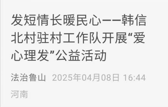 4月8日,鲁山县司法局派驻磙子营乡韩信北村工作队,组织了一场别开生面的“爱心理发”公益活动:请专业理发店理发师到村里,给行动不便的老人免费理发。大家排着队,晒着太阳,聊着天就把头发打理得整整齐齐,让人精神焕发。