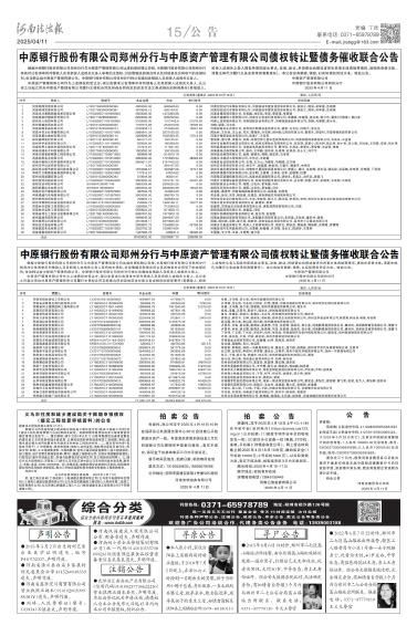 中原银行股份有限公司郑州分行与中原资产管理有限公司债权转让暨债务催收联合公告