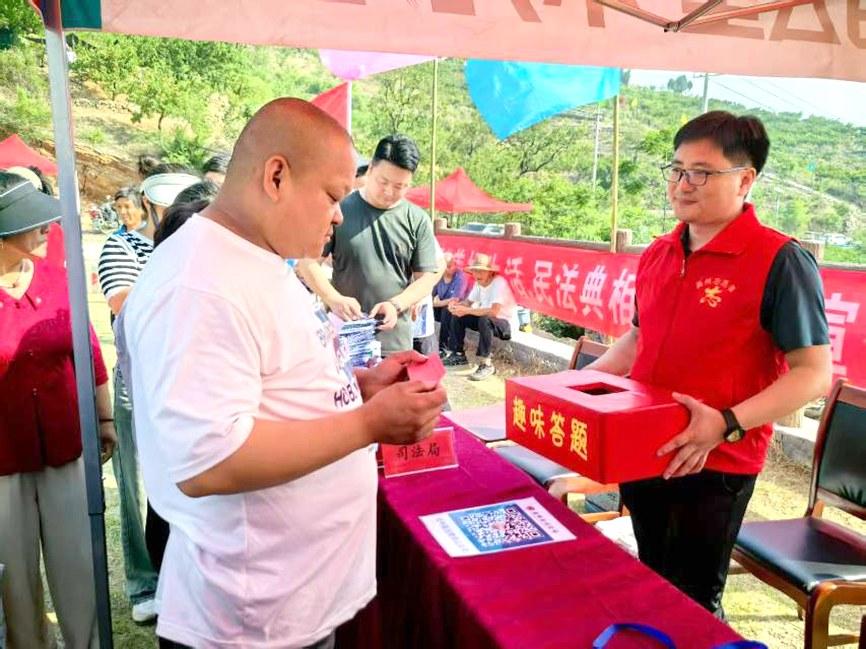 5月16日,禹州市司法局联合该局鸠山司法所,利用鸠山镇闵庄杏果采摘节人流量大的优势,组织工作人员到现场开展民法典普法宣传活动。图为群众参与趣味答题活动。