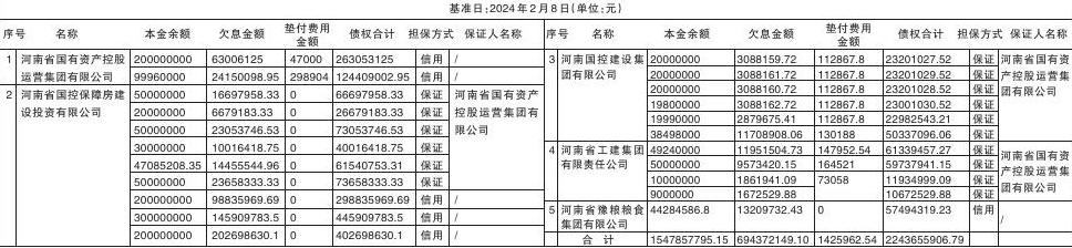 2024年5月20日,中原银行股份有限公司郑州中州大道支行在《河南法制报》发布《关于中原银行股份有限公司郑州中州大道支行受托处置河南省国有资产控股运营集团有限公司等5户不良资产的公告》,现就公告中债权金额予以补充公告: 一、转让基准日为2024年2月8日,截至转让基准日,我行拟批量转让受托清收类不良资产包1个(该项目债权金额合计2243655906.79元,其中本金余额1547857795.15元,欠息694372149.10元,垫付费用1425962.54元)。债权明细表如下: 二、其他事项以原公告为准。 中原银行股份有限公司郑州中州大道支行 2025年6月16日 |