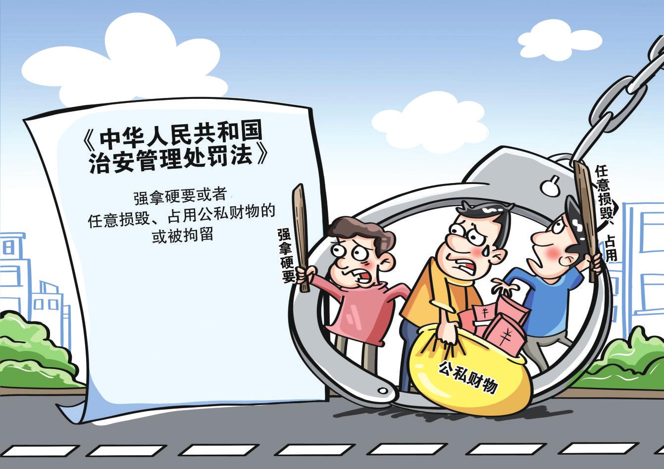 扫码查看更多原创漫画作品 强行索要、肆意地损坏公私财物,将面临治安管理处罚。新修订的治安管理处罚法第三十条规定,强拿硬要或者任意损毁、占用公私财物的,处五日以上十日以下拘留或者一千元以下罚款;情节较重的,处十日以上十五日以下拘留,可以并处二千元以下罚款。 该法于今年6月27日由十四届全国人大常委会第十六次会议表决通过,自2026年1月1日起正式施行。 统筹:张军强 编创:吕林一 |