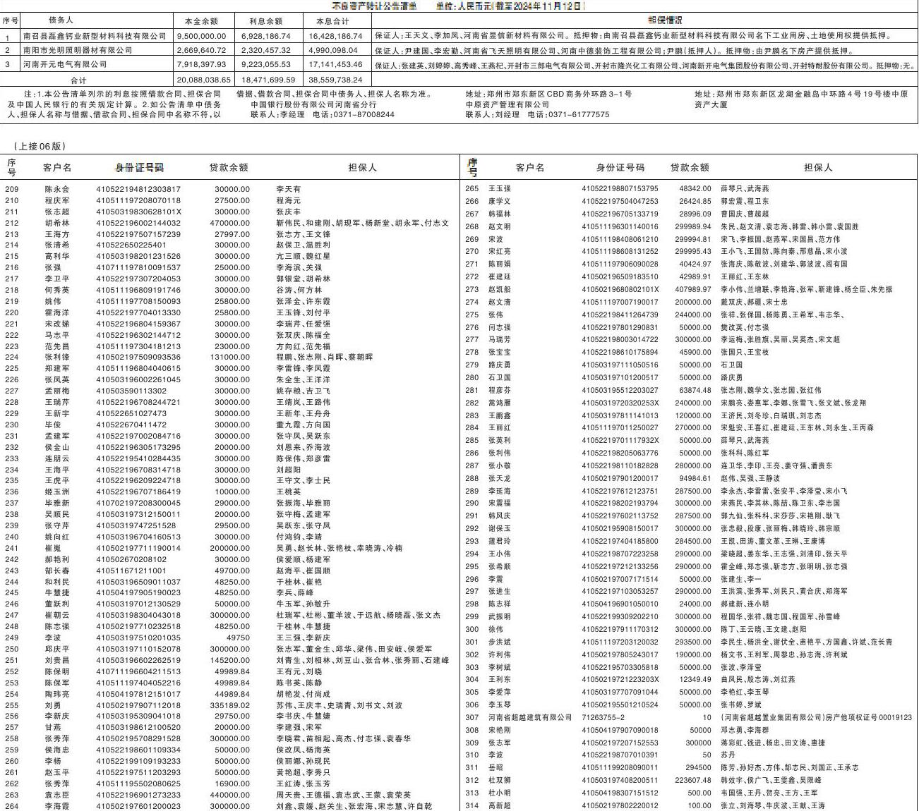 根据中国银行股份有限公司河南省分行与中原资产管理有限公司达成的债权转让安排,中国银行股份有限公司河南省分行(含各分支行)将其对公告清单所列借款人及其担保人享有的主债权及借款合同、担保合同、抵债协议、还款协议和其他相关协议项下的全部权利,依法转让给中原资产管理有限公司。中国银行股份有限公司河南省分行特公告通知各借款人、担保人以及借款人、担保人因各种原因发生更名、改制、歇业、吊销营业执照或丧失民事主体资格等情况的相关承债主体或清算主体。 中原资产管理有限公司作为上述债权的受让方,现公告要求公告清单中所列包括但不限于债务人、担保人及其清算业务人等其他相关当事人,从公告发出之日起立即向中原资产管理有限公司履行主债权合同及担保合同约定的还本付息义务或相应的担保责任(若借款人、担保人因各种原因发生更名、改制、歇业、吊销营业执照或丧失民事主体资格等情形,请相关承债主体、清算主体代为履行义务或承担清算责任)。 特此公告 中国银行股份有限公司 中原资产管理有限公司河南省分行 2025年9月24日 |