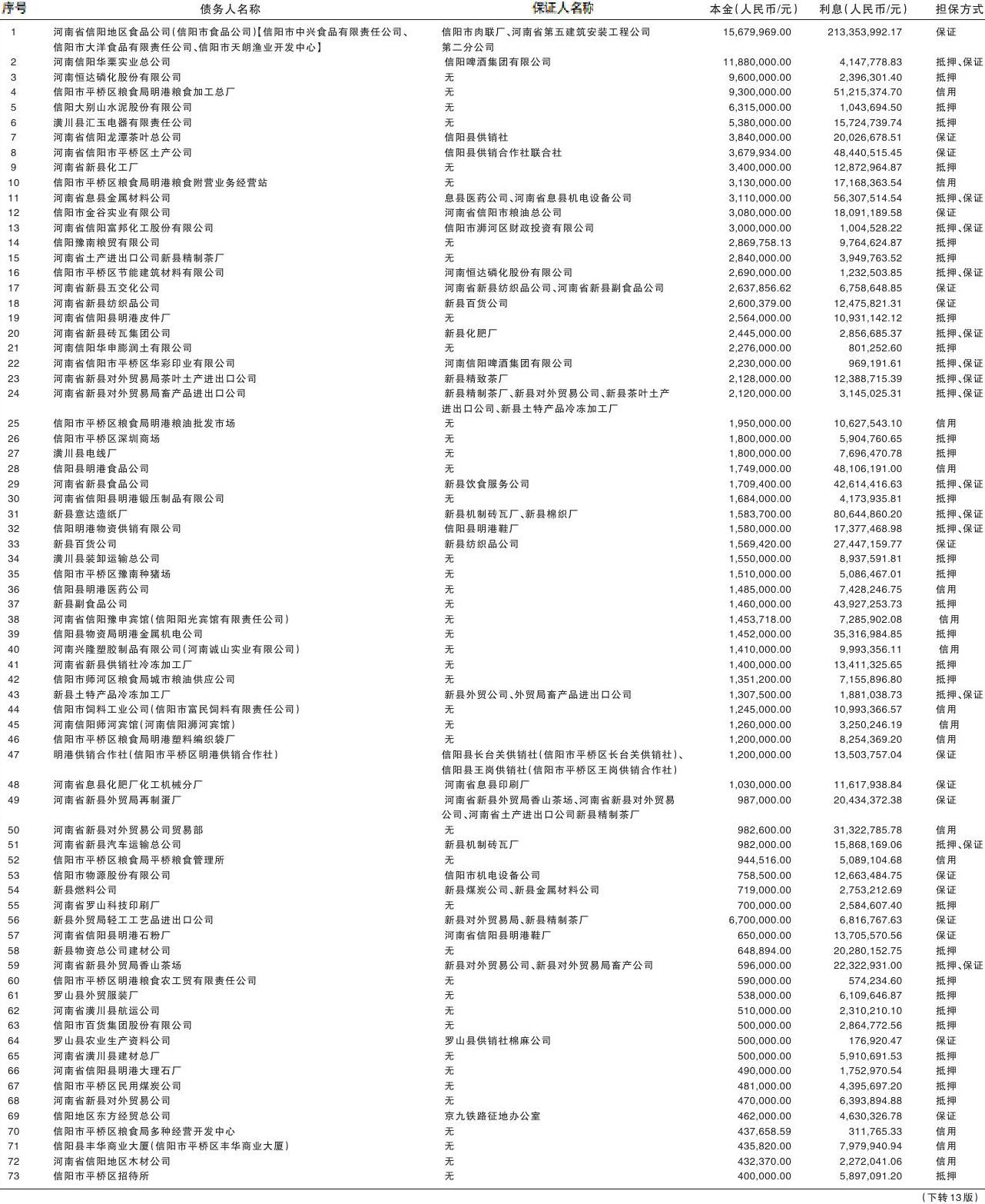 我公司现公告要求公告清单中所列债务人及其担保人,自公告发布之日起立即向中国长城资产管理股份有限公司河南省分公司履行主债权合同及担保合同约定的还本付息义务或相应的担保责任。如本公告所列债务人及其担保人发生任何更名、改制、分立、合并、歇业、破产、注销或其他丧失民事主体资格等情形,请相关承债主体、清算主体等自本公告发布之日起依法立即向中国长城资产管理股份有限公司河南省分公司履行相关义务、承担清算责任以及其他相关法律责任。 上述债权信息仅供参考,最终以借据、合同、法院裁判等有关法律资料以及债务人、保证人、抵押物、质押物等实际情况为准。 联系人:张女士 联系电话:0371-65510274中国长城资产管理股份有限公司河南省分公司2025年9月25日 |