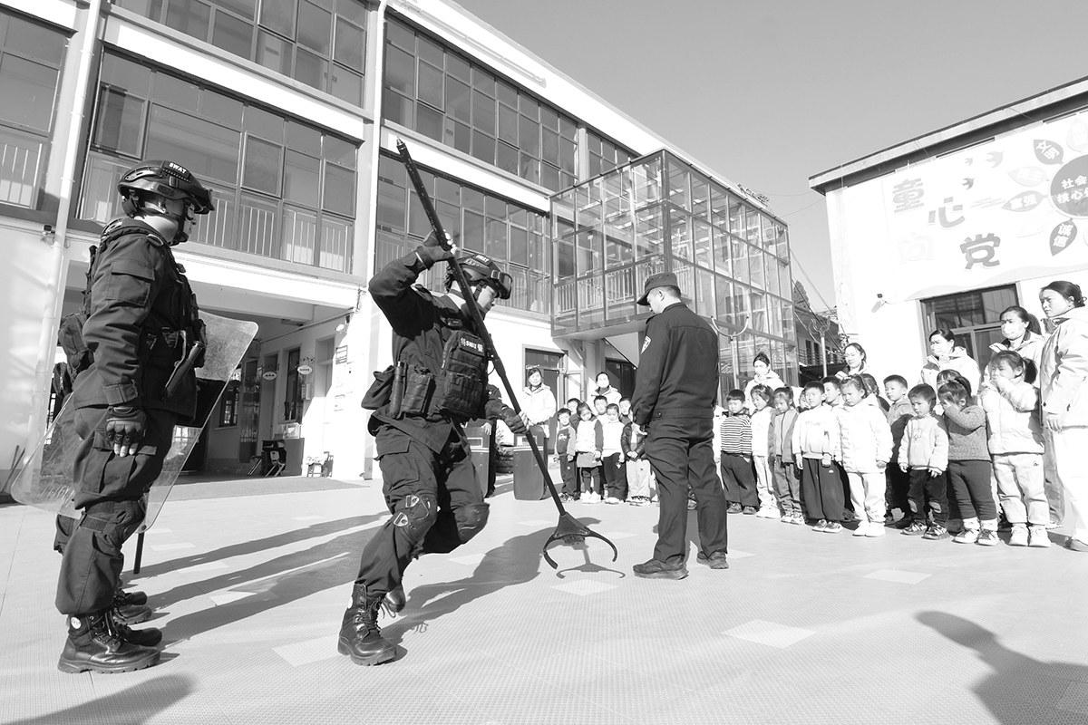 图为11月19日,巡特警大队队员和卫溪派出所民警辅警在浚县县直幼儿园进行最小应急作战单元模拟演练。